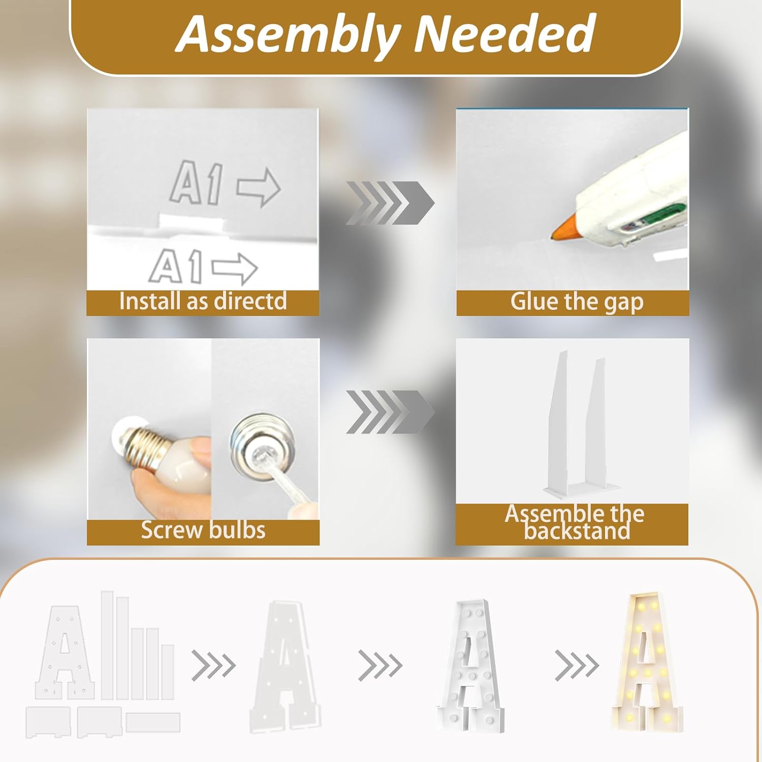 - 【Assembly Required】Each marquee light up letters is made of precisely pre-cut foam board, comes with the same model of light string and LED bulb, and a user-friendly instruction manual. According to our installation manual, ① Fold the side panels along the cutting line and stick them to the bottom panel with hot melt glue according to the corresponding number. ② Screw the bulb onto the single board, and then install the LED light string into the bulb. (Note: Glue gun and battery not included)