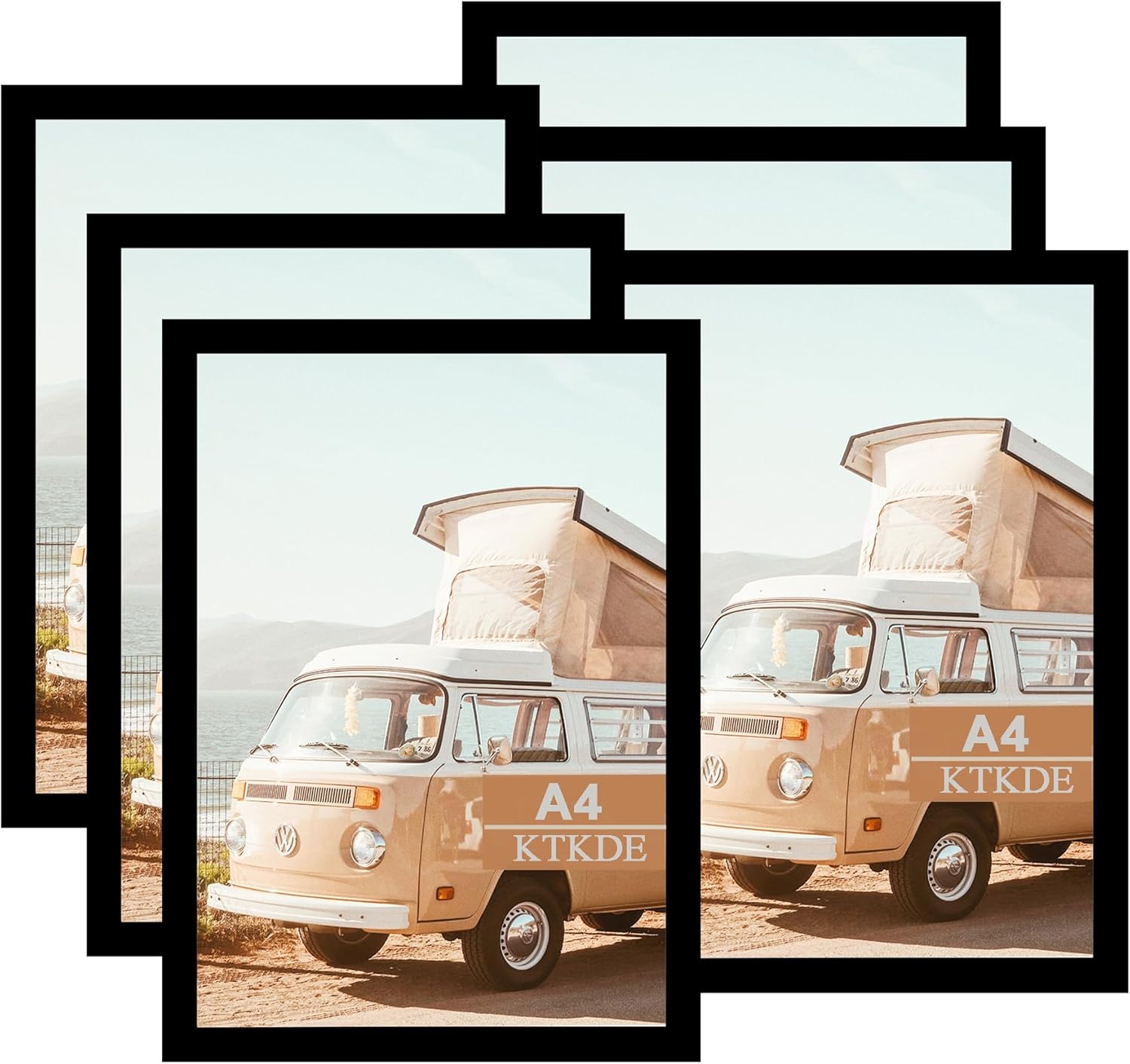 - KTKDE A4 BLACK FRAMES: Durable, gallery-style A4 photo frame; the frame's front has clear tempered shatter-resistant glass and a sturdy backboard to keep the photo in place.Composite wood frame with a polished tempered shatter-resistant glass front that gives a clear view of your picture. Perfect for 8.3x11.7 inches or A4 photos, documents, or artwork.