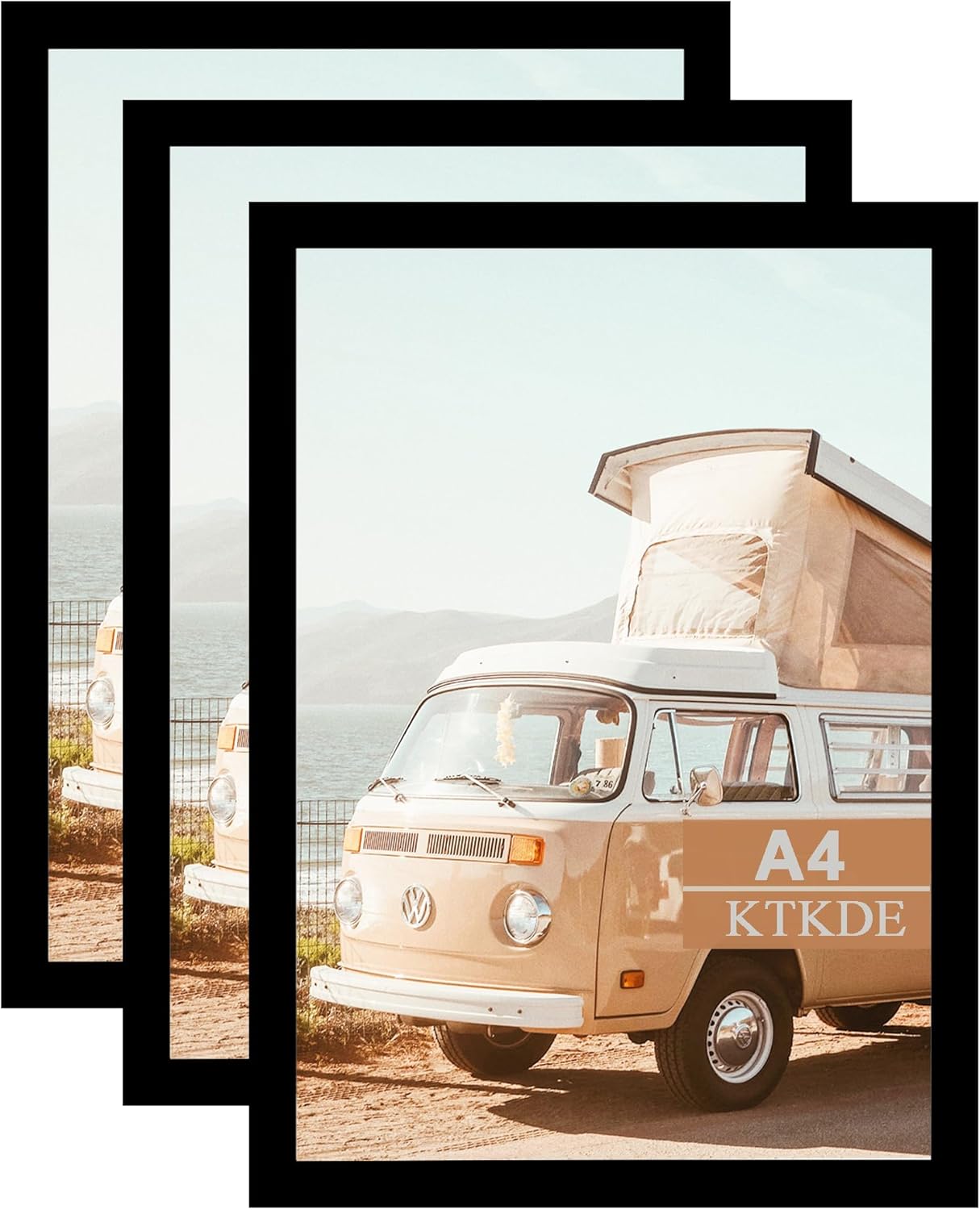 - KTKDE A4 BLACK FRAMES: Durable, gallery-style A4 photo frame; the frame's front has clear tempered shatter-resistant glass and a sturdy backboard to keep the photo in place.Composite wood frame with a polished tempered shatter-resistant glass front that gives a clear view of your picture. Perfect for 8.3x11.7 inches or A4 photos, documents, or artwork.