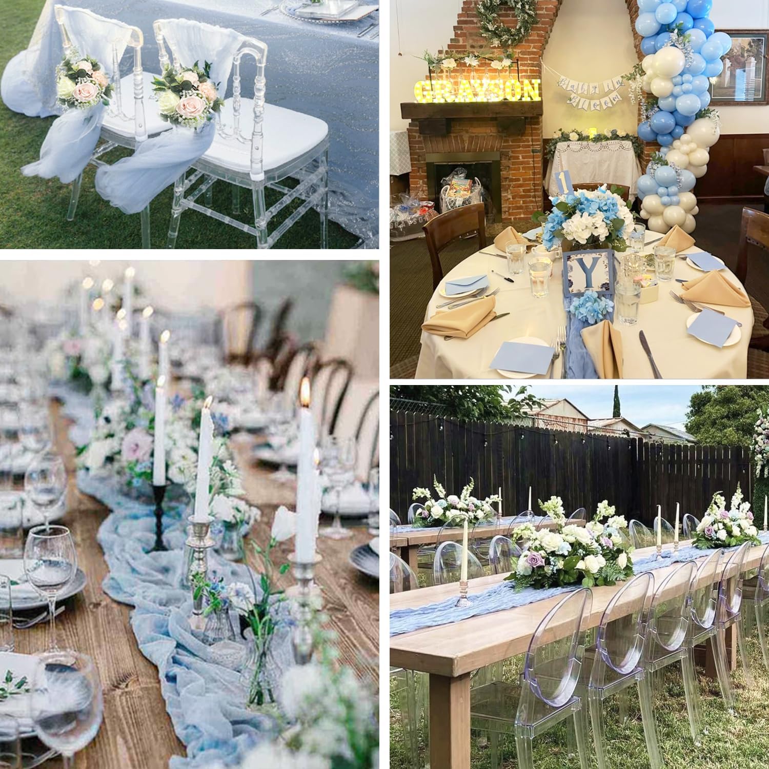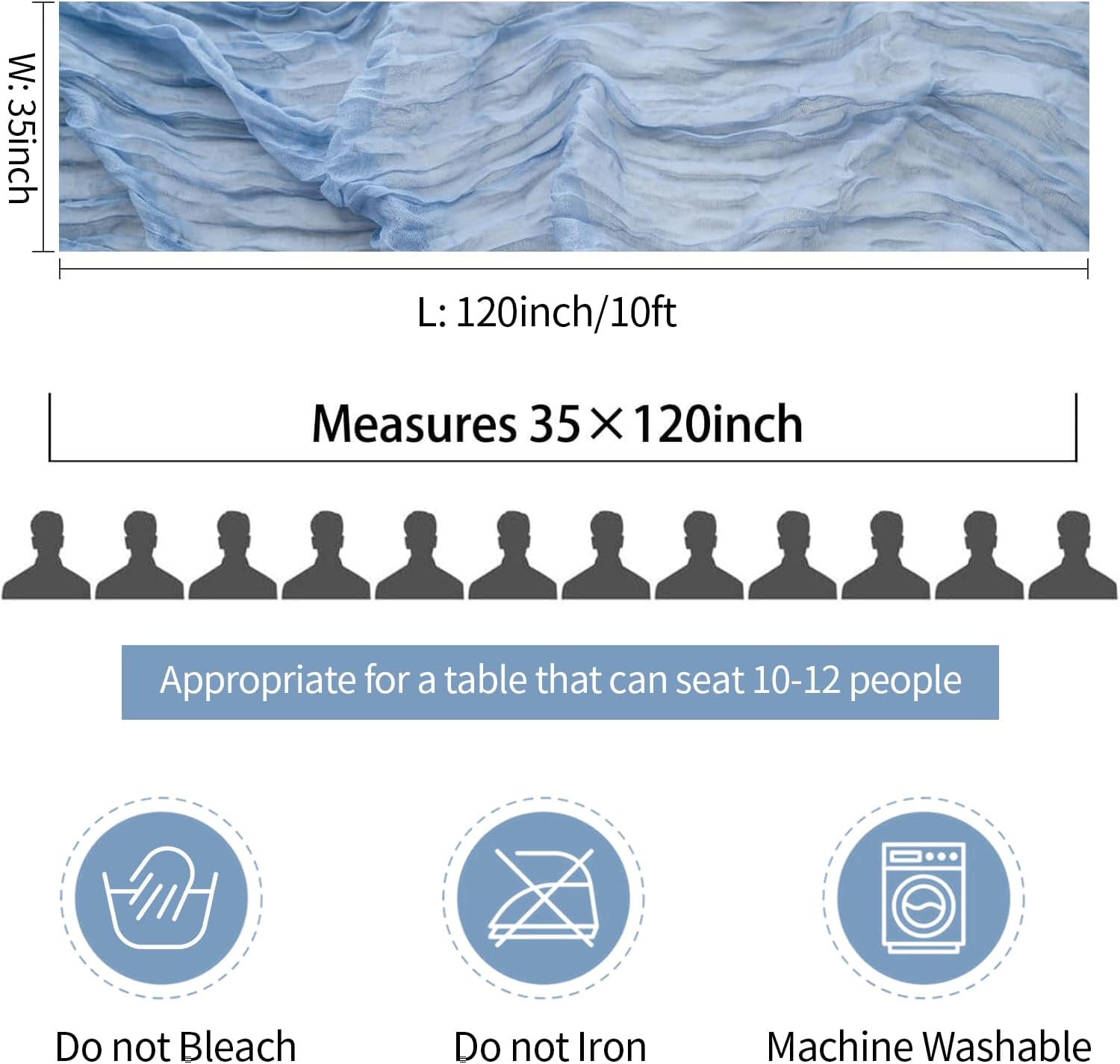 - 🍸【Long Dusty Blue Centerpieces for Table】The size of each gentle blue table runner cheesecloth is approximately 35 x 120 inches / 90 x 300 cm, which is large enough to cover rectangle and round tables, can also be spliced together for long tables. A simple and easy way to dress up a table as wrinkled design no ironing is required & they add a soft touch to your decor! The fluffy gauze table runner can be compressed, lightweight, and compact, easy to store, more space-saving.