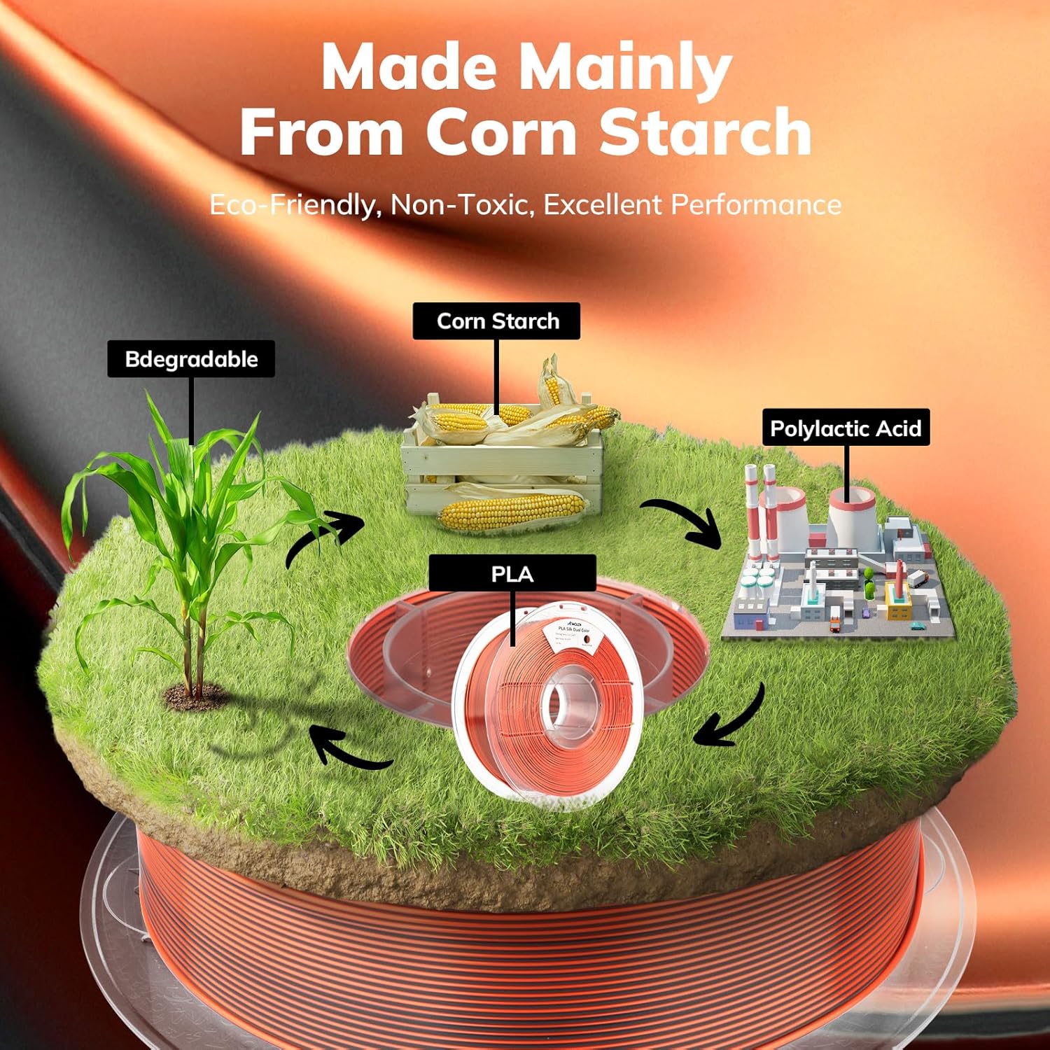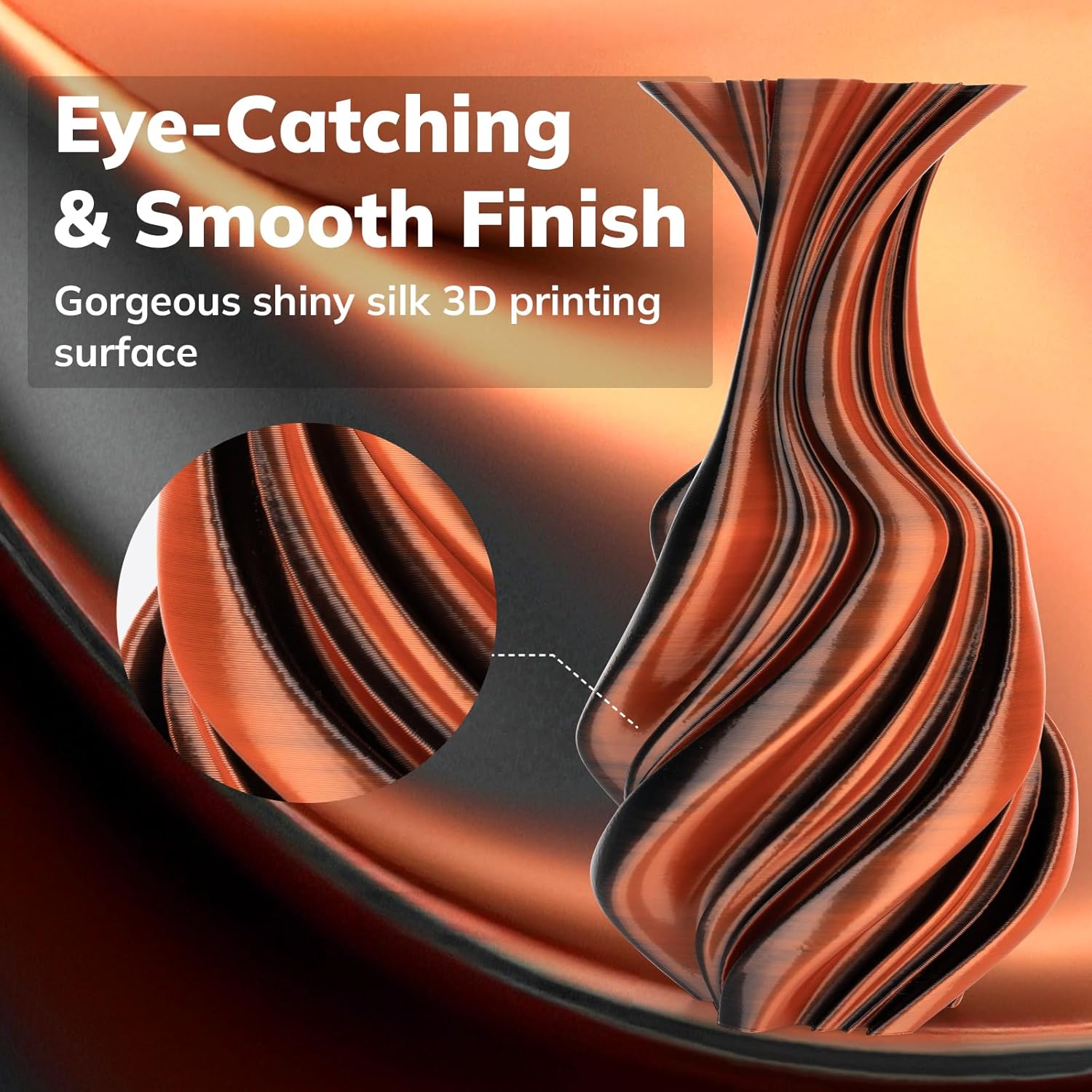 - Eye-catching Silk PLA: Shiny orange and black combination of magic 1.75mm PLA filament, make the two sides of your print appear in different colors. Without polishing, you can get a silk glossy and smooth 3d prints. Beginner & expert friendly, it’s your go-to for eye-catching designs all year round