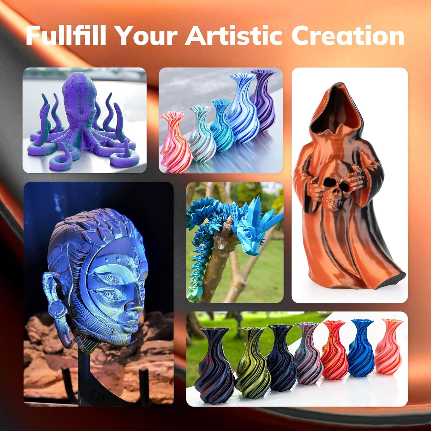 - Silk Dual Color PLA: Experiment with multiple hues without the commitment of larger spools. You can print beautiful multicolors in one PLA filament, perfect for arts, crafts, DIY. Whether you're crafting Easter decorations, designing Halloween costumes, creating Christmas ornaments, or making Valentine’s surprises, this filament delivers stunning results every time