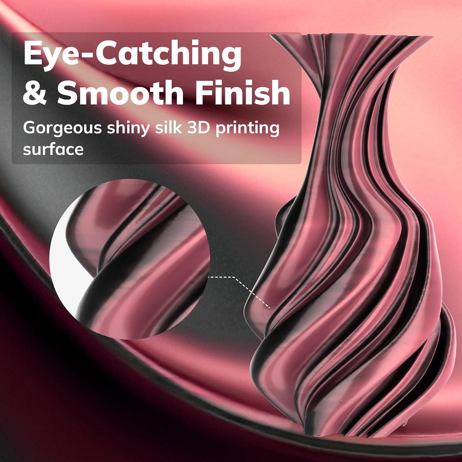 - Eye-catching Silk PLA: Shiny pink and black combination of magic 1.75mm PLA filament, make the two sides of your print appear in different colors. Without polishing, you can get a silk glossy and smooth 3d prints. Beginner & expert friendly, it’s your go-to for eye-catching designs all year round