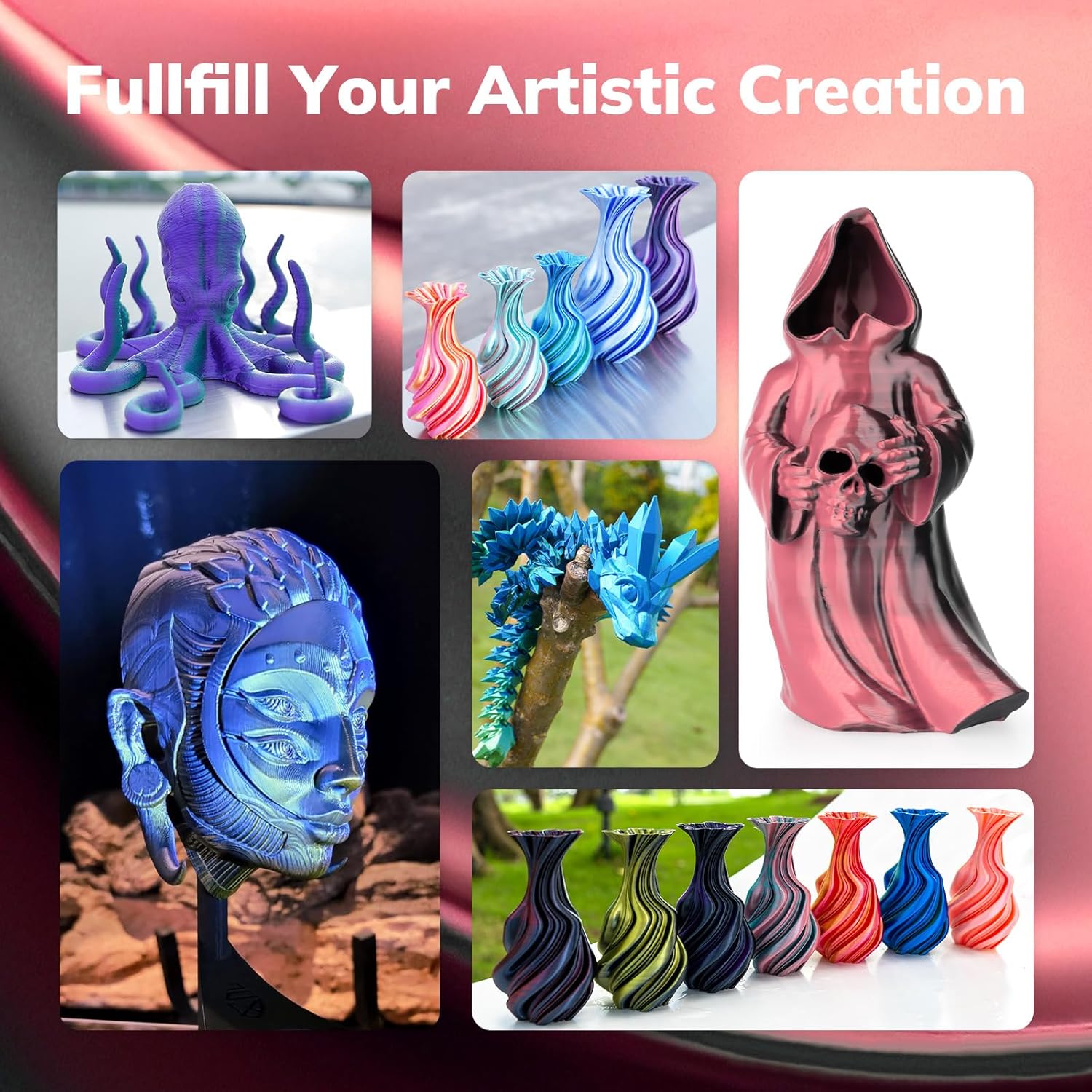 - Silk Dual Color PLA: Experiment with multiple hues without the commitment of larger spools. You can print beautiful multicolors in one PLA filament, perfect for arts, crafts, DIY. Whether you're crafting Easter decorations, designing Halloween costumes, creating Christmas ornaments, or making Valentine’s surprises, this filament delivers stunning results every time