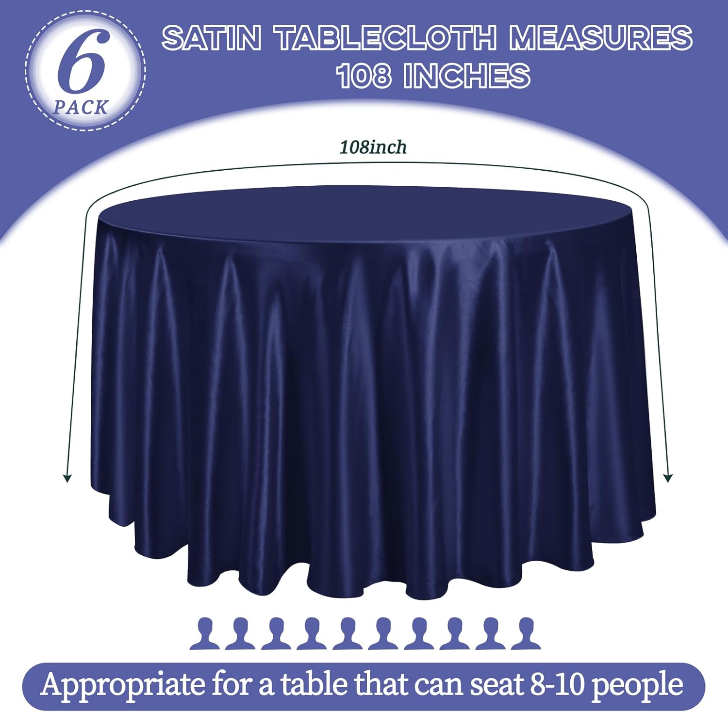 - 【Round Satin Tablecloths】6 Pieces premium navy blue satin round tablecloth. The size of silk satin table cover is 108 inches, large enough to decorate a table that can accommodate 8-10 persons. It is suitable for most household round tables and can meet your different needs. Sufficient quantities are sufficient for party events to enhance the charm of your event decoration. The tablecloth size is usually larger than your table size. Please measure your table size before buying.