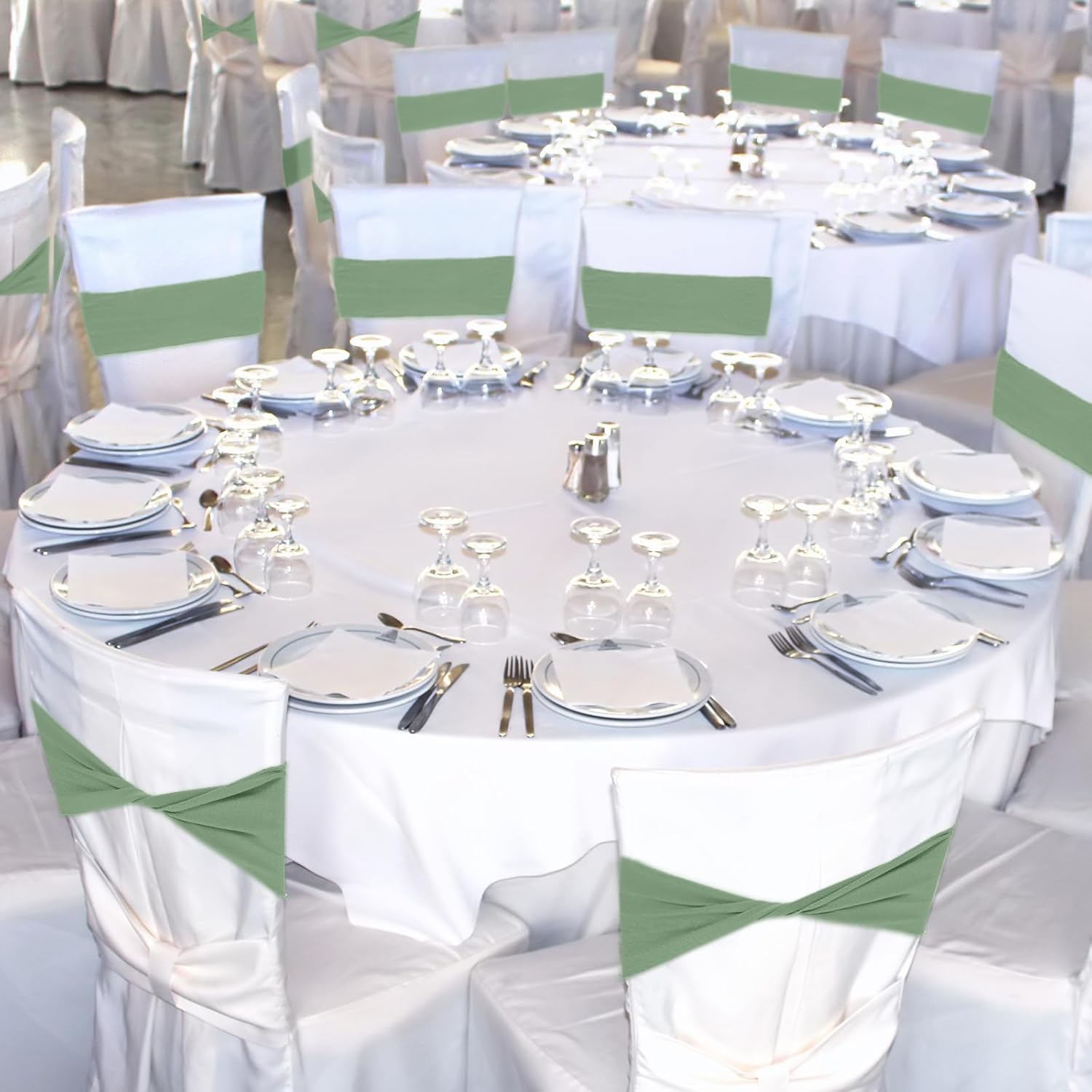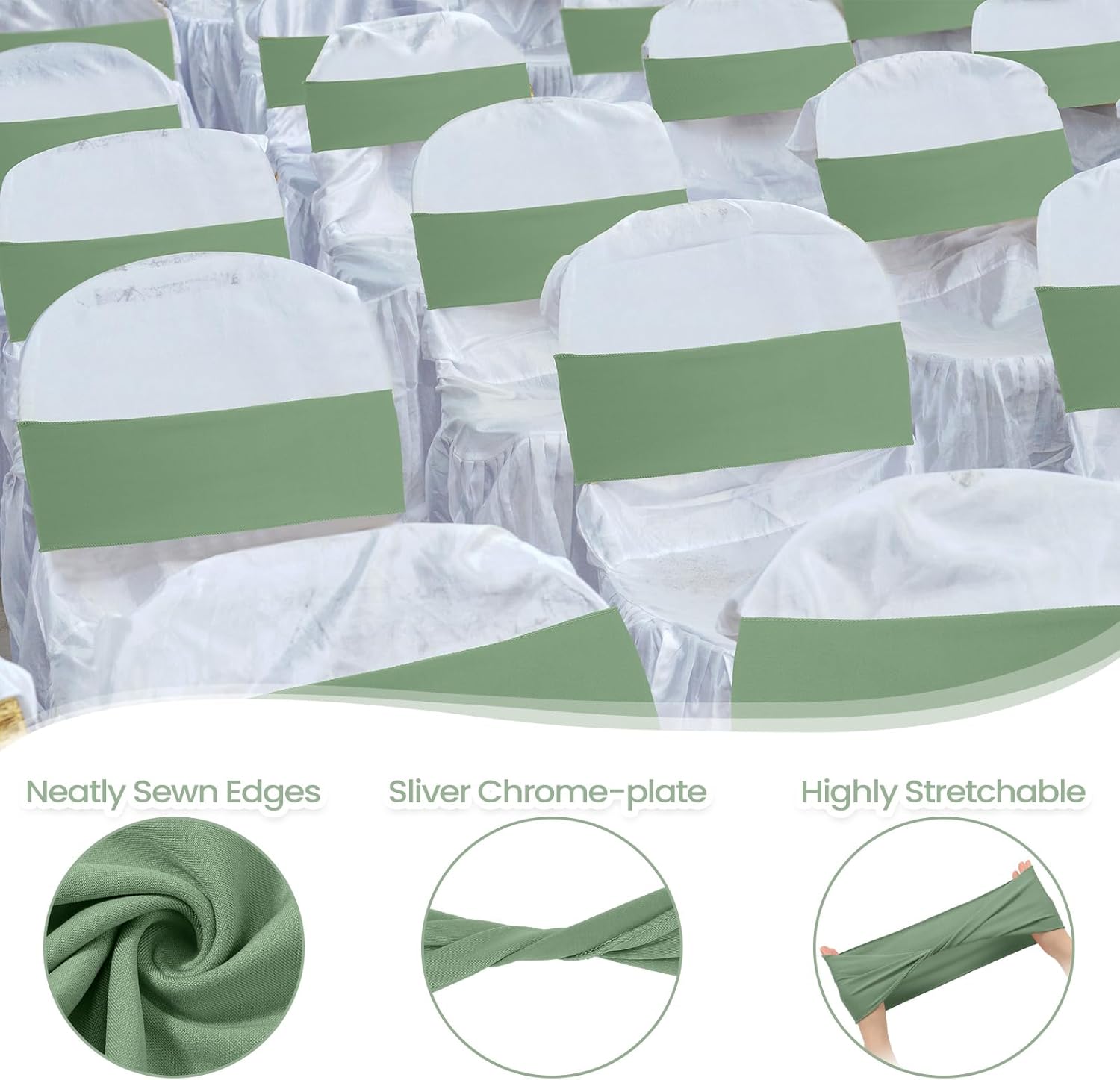 Kinlop 50 Pcs Spandex Chair Sashes Bows Chair Bands Slider Sashes for Covers Elastic Bands Ties Without Buckle Decorations for Wedding Party Events Ceremony Birthday(Sage Green)