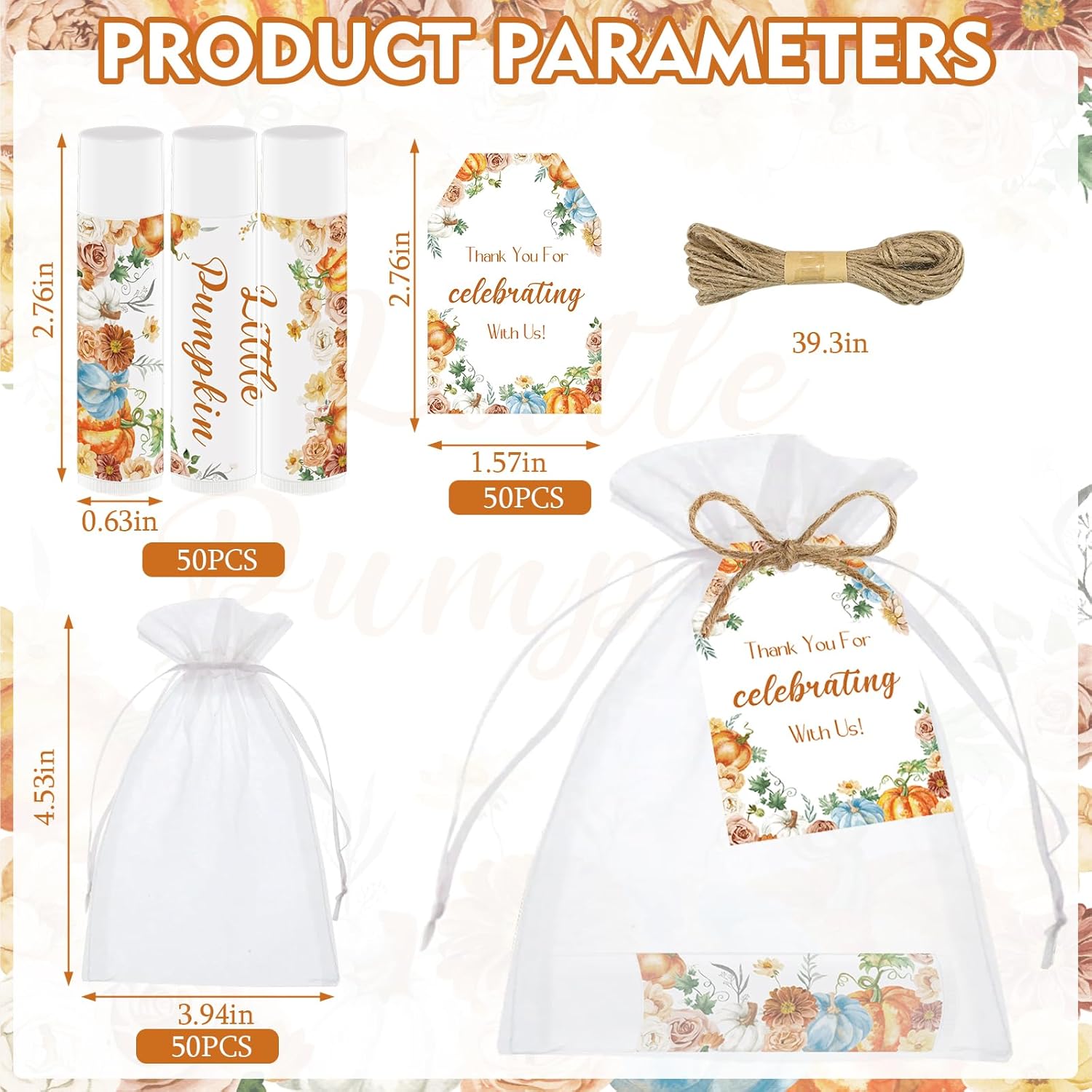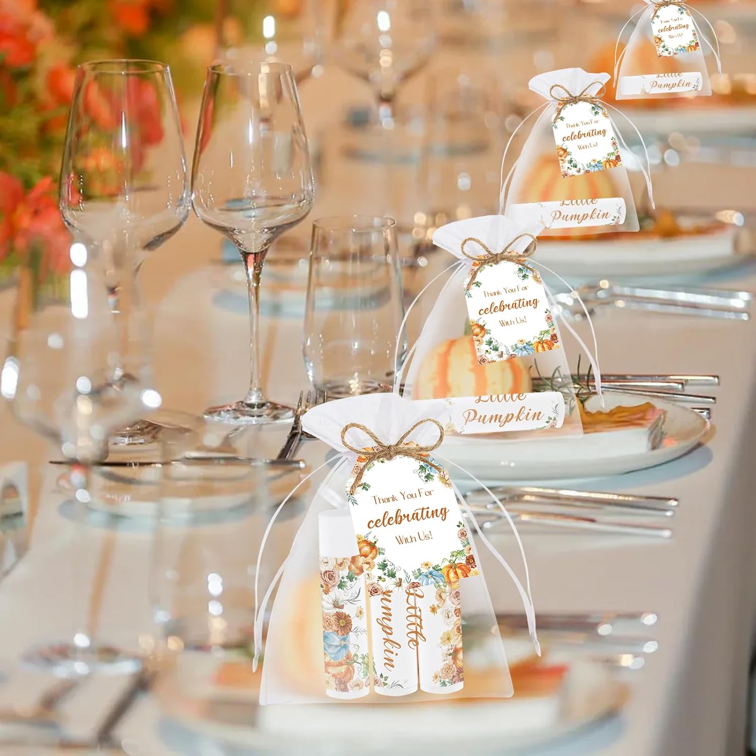 - Comprehensive Package: Our Fall Pumpkin Theme lip balm party favors include 50 lip balms, 50 organza bags and 50 thank you cards, adequate quantity can meet your gifting needs for baby shower or other parties
