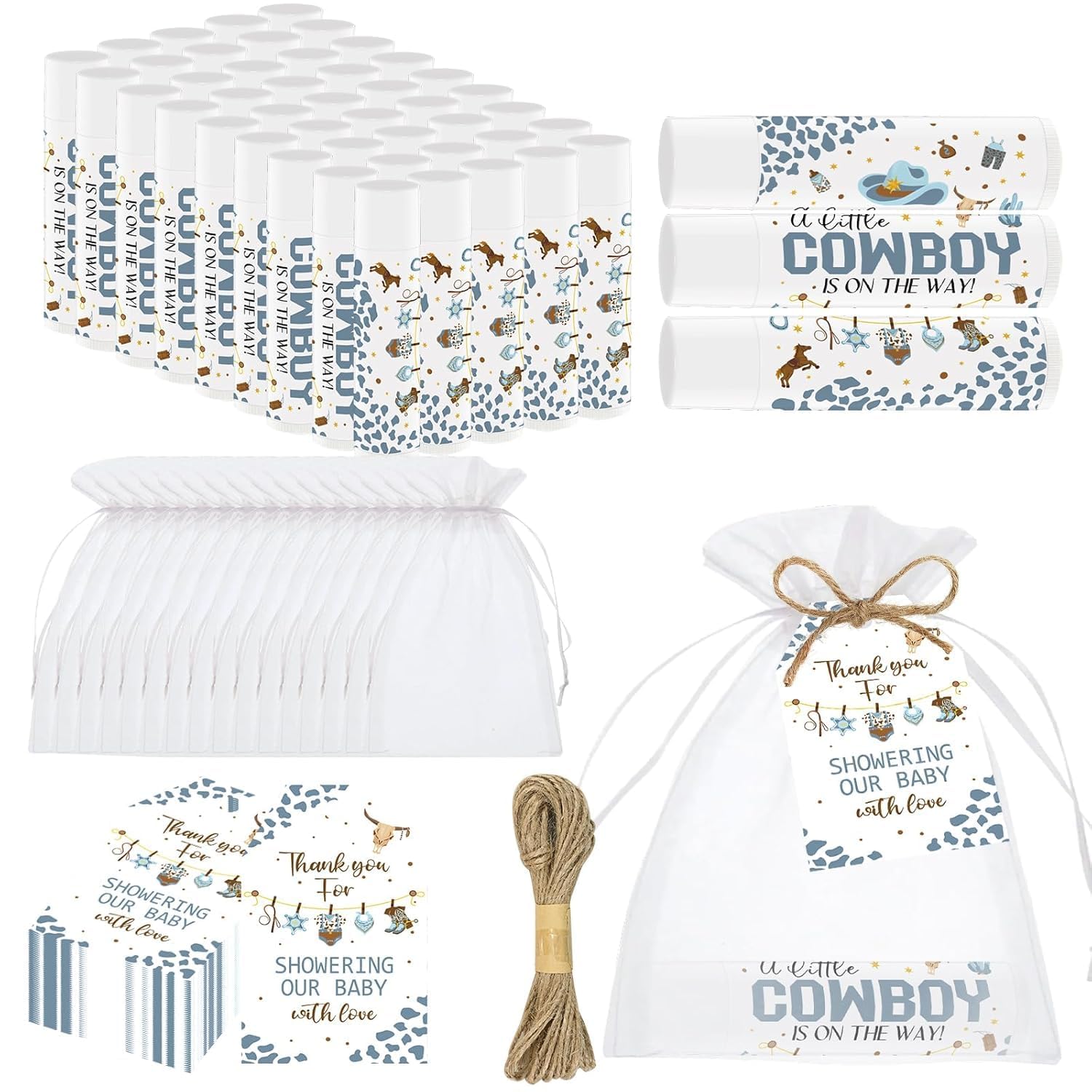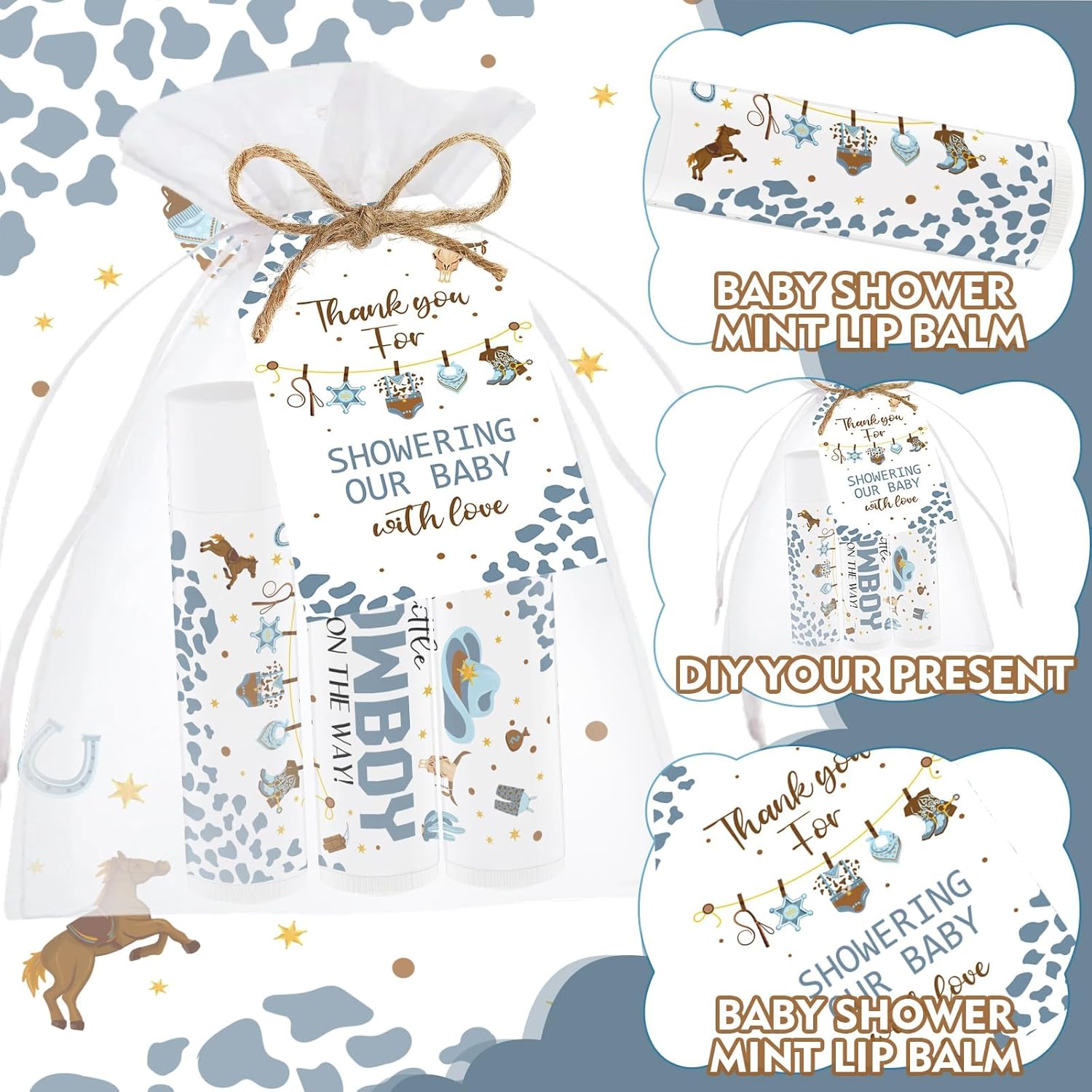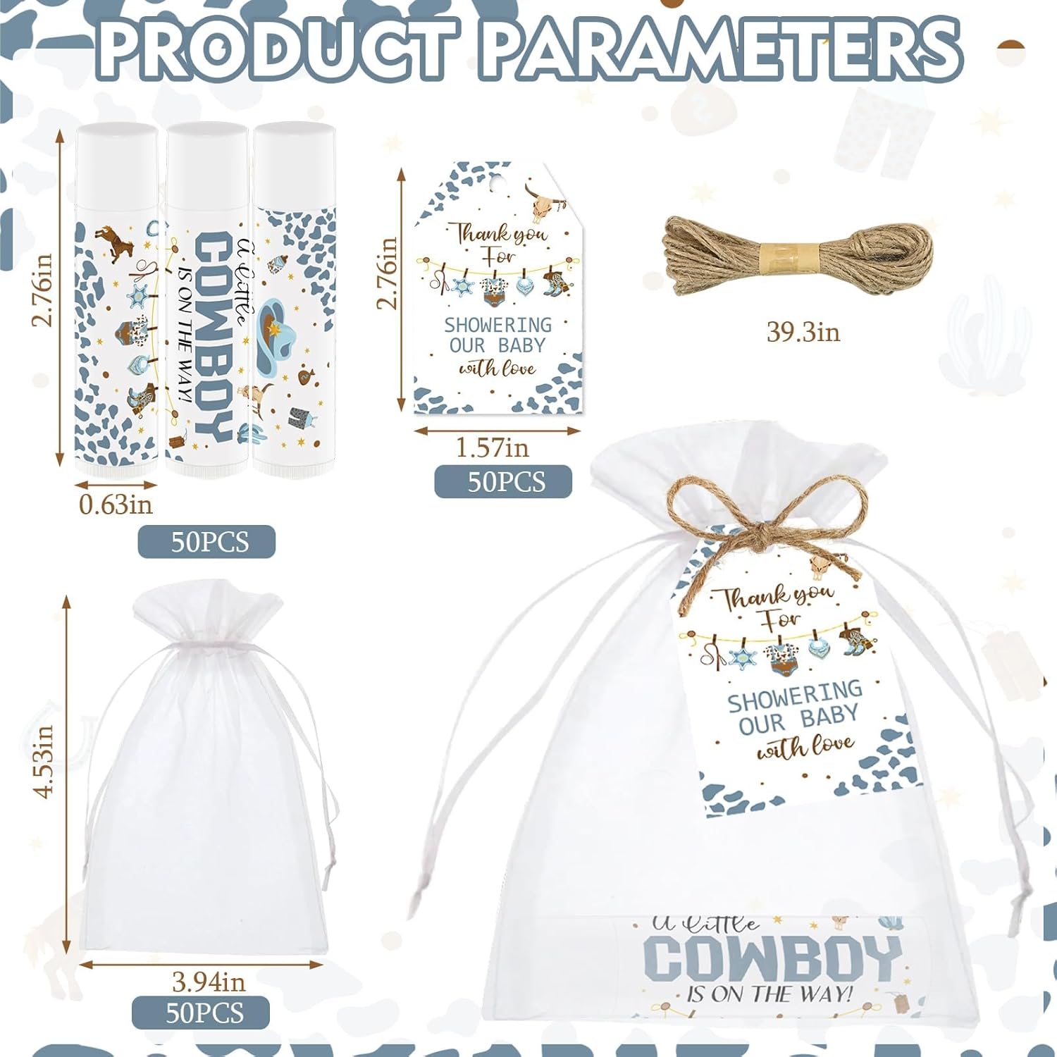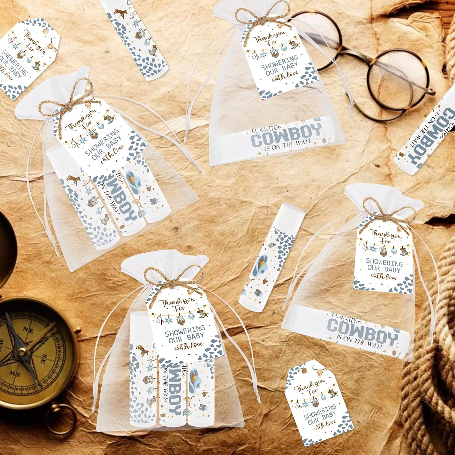 - Comprehensive Package: Our cowboy theme lip balm party favors include 50 lip balms, 50 organza bags and 50 thank you cards, adequate quantity can meet your gifting needs for baby shower, bridal shower or other parties