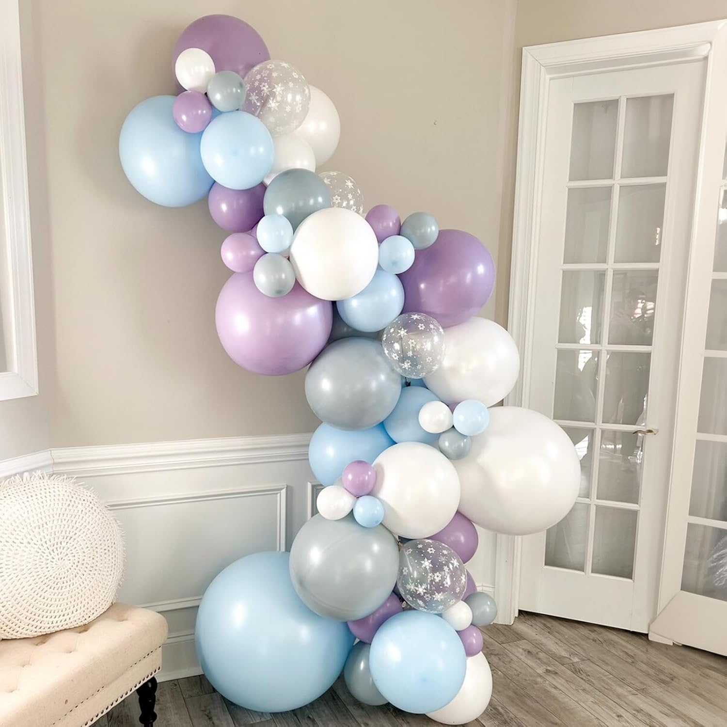 - Snowflake Balloons: You will get 5 different colors of 12 inch balloons, dusty purple balloons 20 pcs, dusty blue balloons 20 pcs, metallic dark peacock blue balloons 10 pcs, snowflake clear balloons 5 pcs, silver confetti 5pcs, total 60 pieces, with 1pc balloon ribbon.