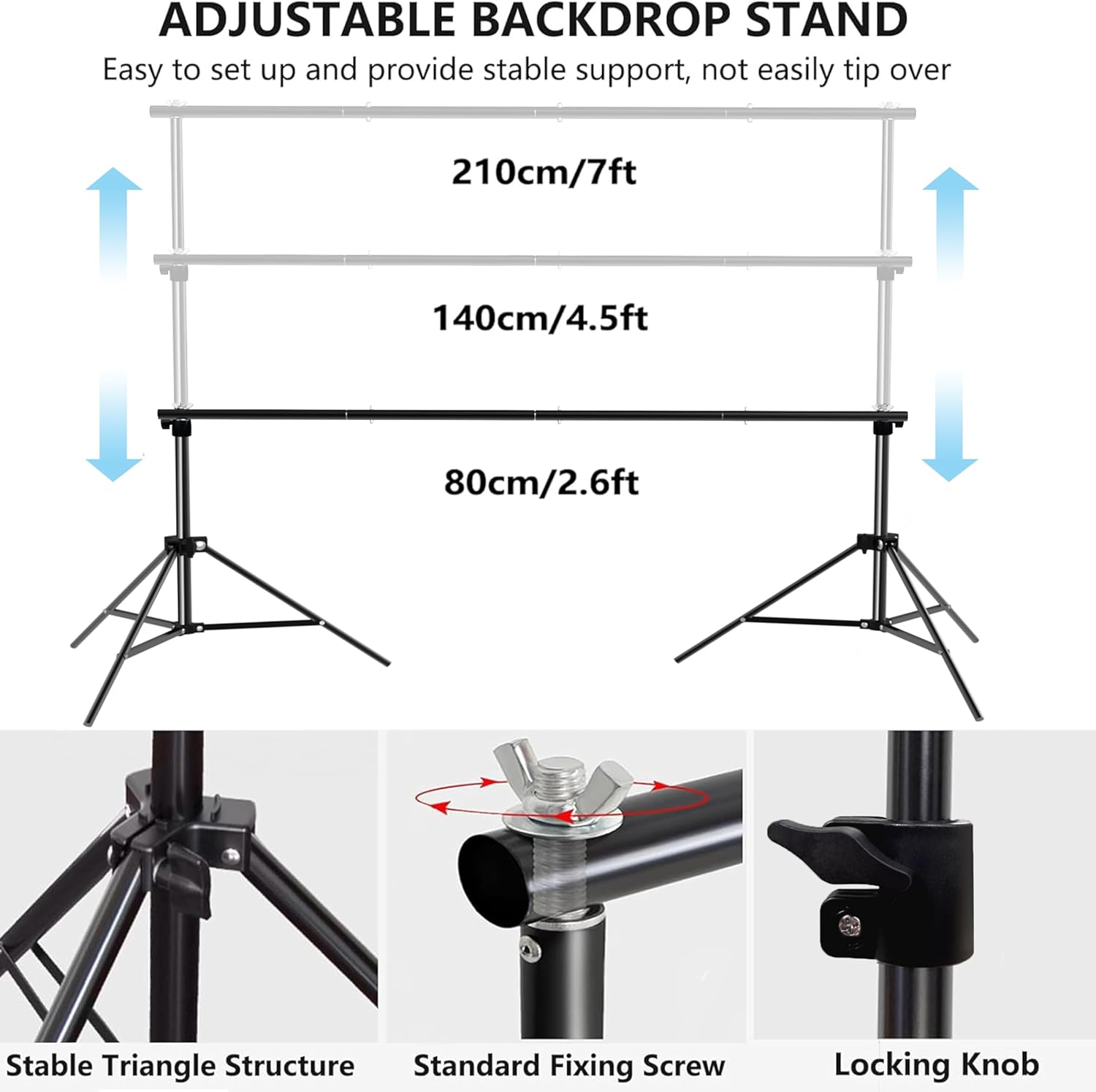 - 【Adjustable Background Support Stand】The photography backdrop stand adopts triangular structure making it more stable to support photographic equipment. And the height is adjustable from 2.7 feet to 7.5 feet.