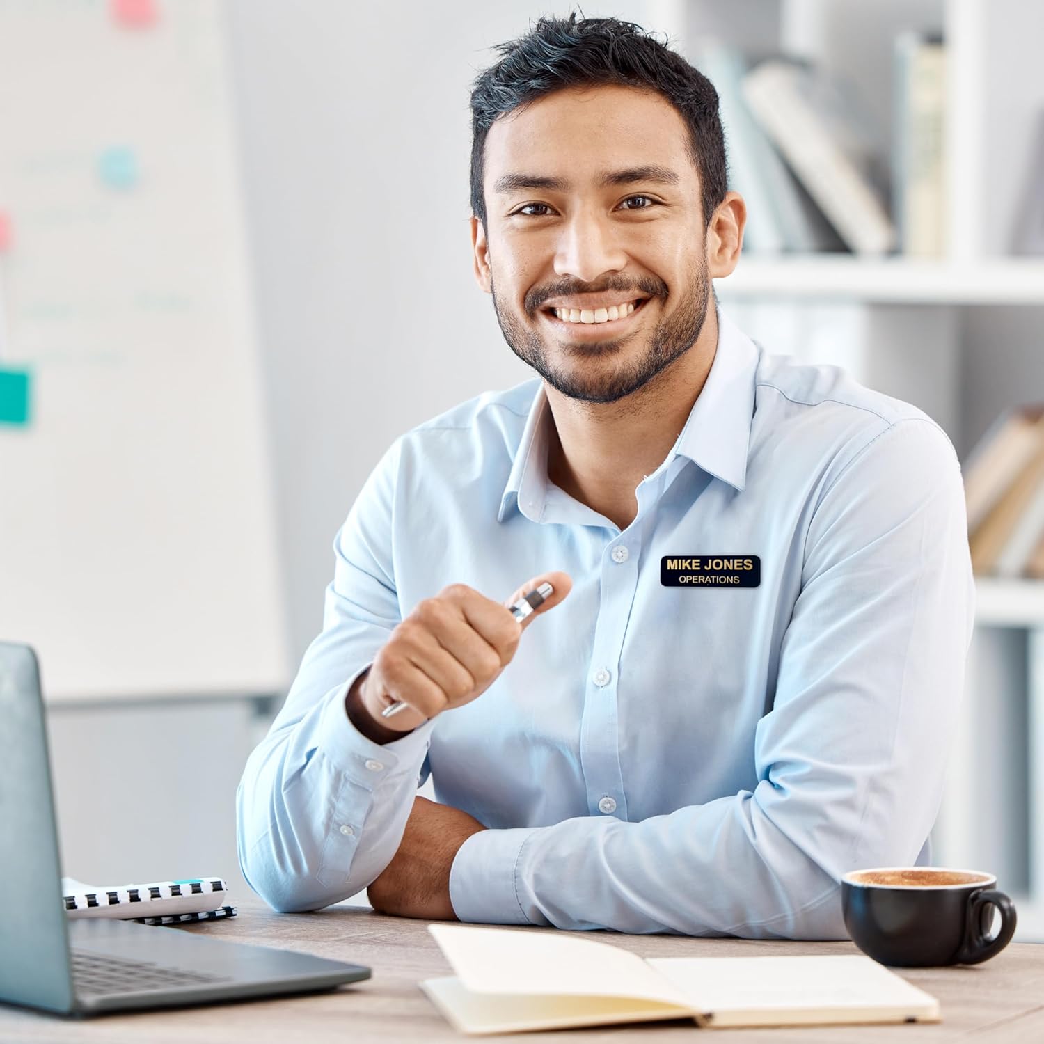 Custom Engraved Name Tag Badges – Personalized Identification with Pin or Magnetic Backing, 1.5 Inch x 3 Inches, Radiant Gold/Black