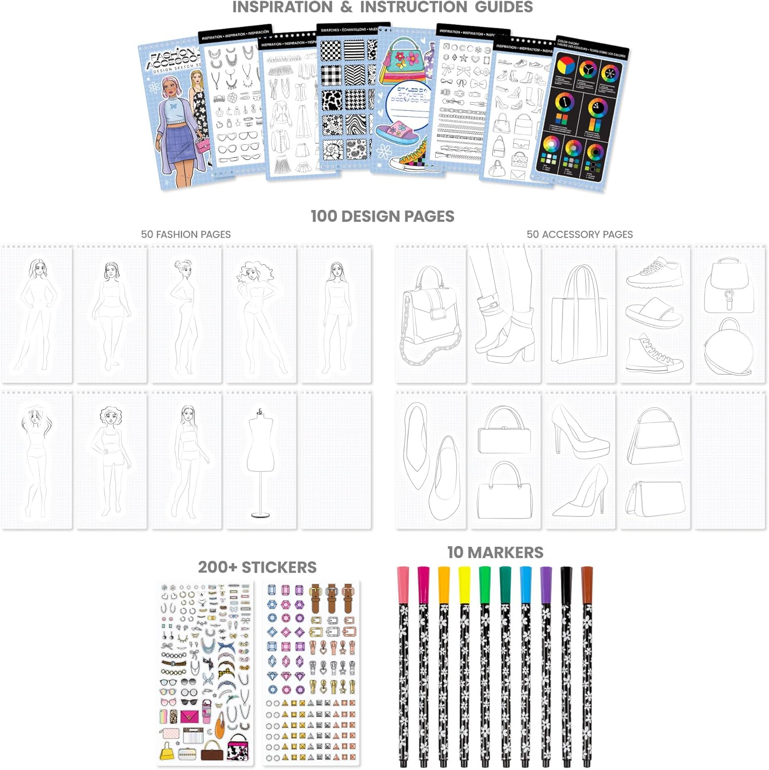 - WHAT'S INCLUDED: This set includes 100 sketch sheets, 2 sticker sheets and 10 markers. Instructions and inspiration guide also included