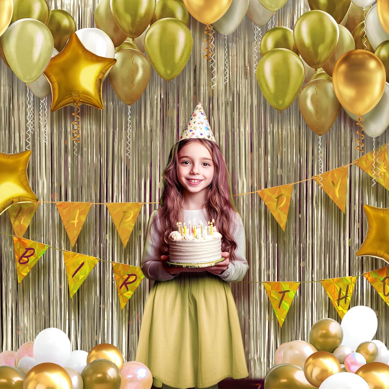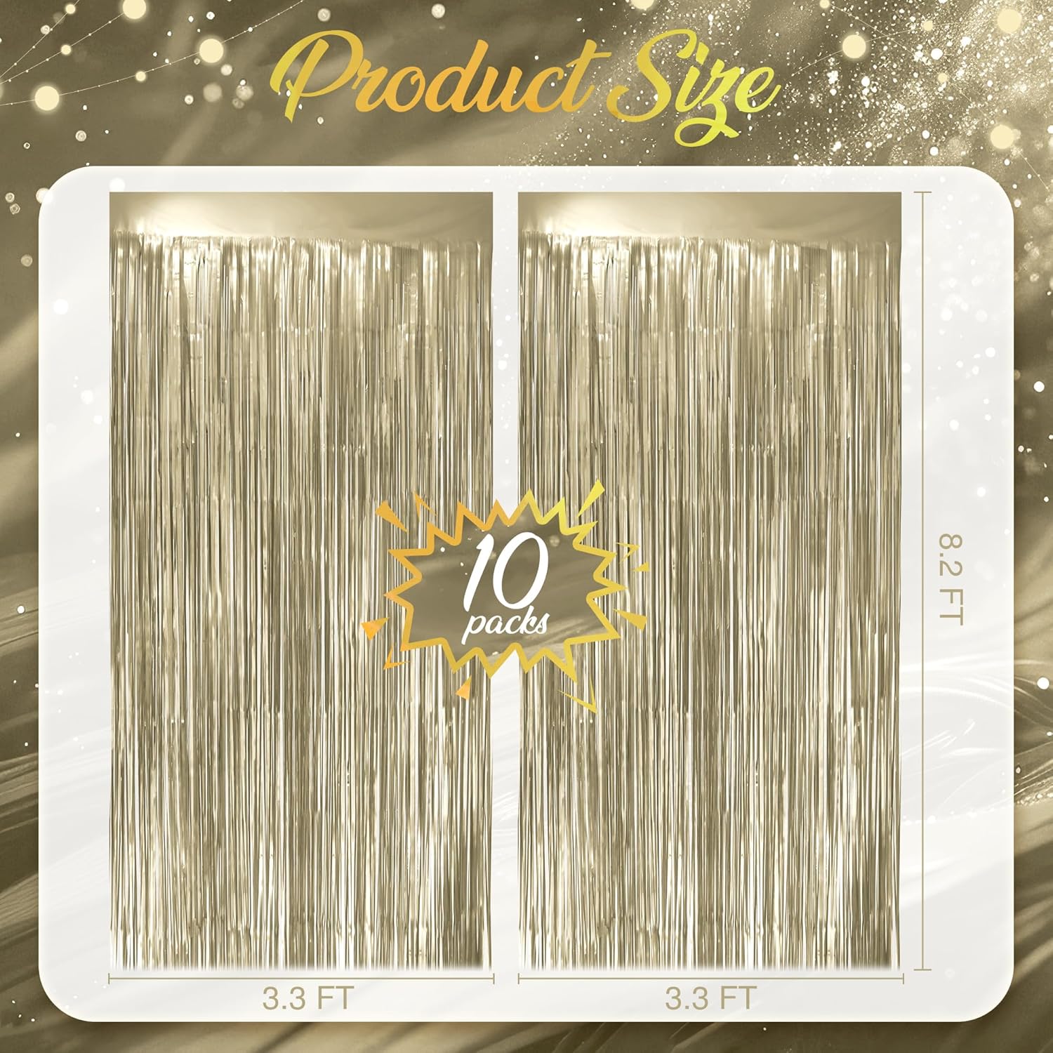 10 Pack Metallic Champagne Gold Fringe Backdrop, 3.2x8.2ft Shining Foil Tinsel Curtains, Birthday Party Decorations Door Streamers for Halloween, Christmas, Wedding, Graduation, Holiday, Theme Events