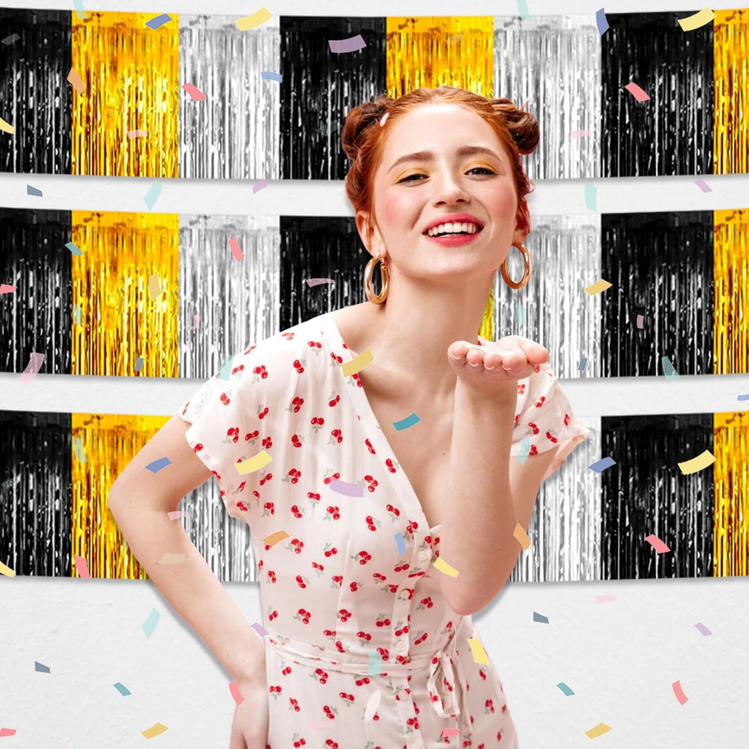 6 Pack 10 Feet Black Gold Silver Foil Fringe Garland Metallic Tinsel Streamers Banner Wall Hanging Curtain Backdrop for Parade Floats, Birthday, Graduate, Mother's Day, Wedding Party Decoration