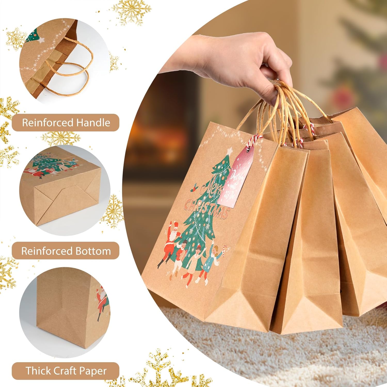 LYLIN 12Pcs Kraft Christmas Gift Bags with Handles, Small Xmas Treat Bags Reusable Gift Bags for Wrapping Gifts, Party Favors and Holiday Decor
