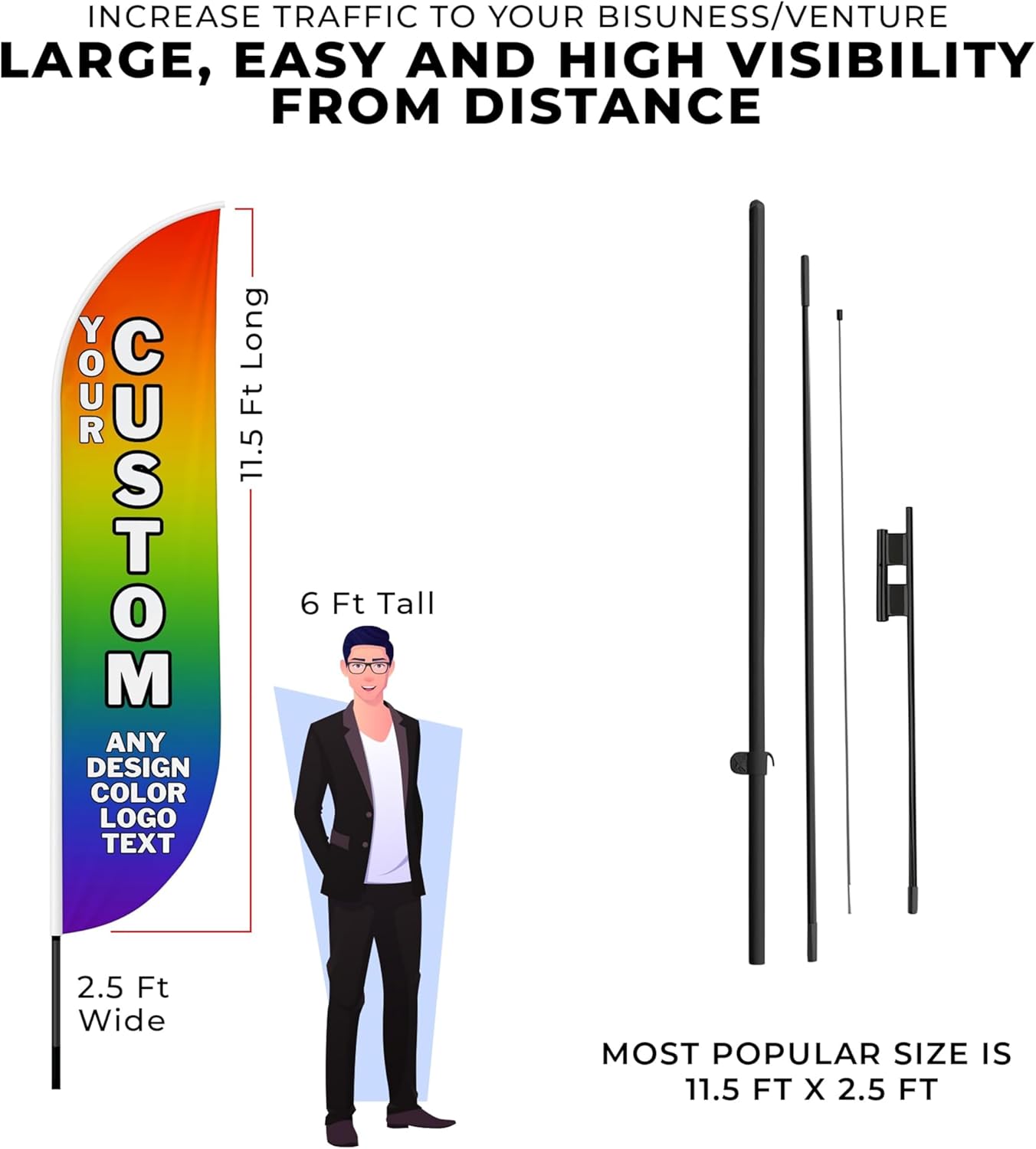 - Eye-catching dynamic displays: our flags will be very eye-catching for indoor and outdoor use and make your location or events stand out, the flying feather banner will grab attention at a distance to attract many new crowds to your site. the feather banner size is very large (11.5ft x 2.5ft) and visible enough from far away, you may put the feather banner up in front of your business, at the entry, or on the sidewalk, really a must-have and cost-effective way to increase traffic to the business