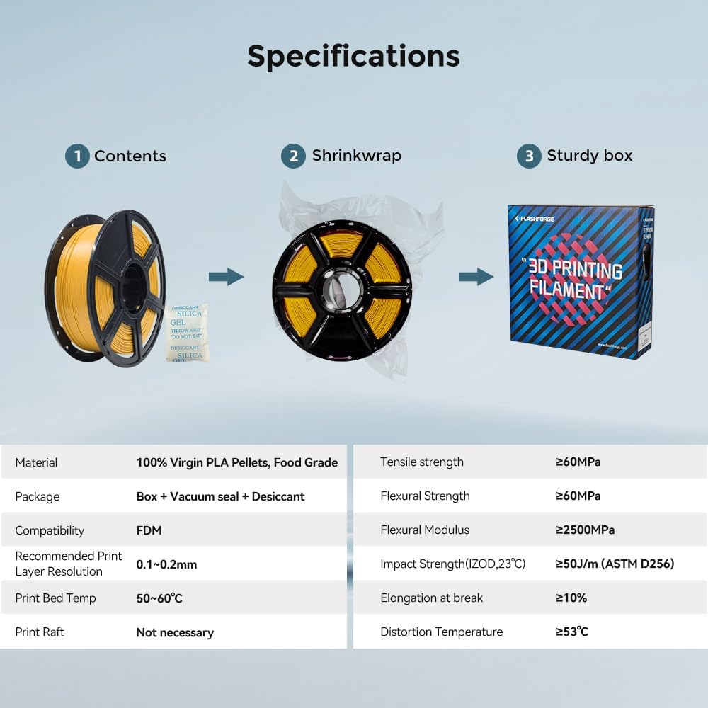 - 【High Printing Performance】FLASHFORGE 3D printer filament 1.75mm PLA is designed to meet the needs of highly detailed printing and ensure a consistent color, dimensional accuracy, and no warping, no jamming, or layer delamination issues. It provides the best printing experience for 3D printing enthusiasts.