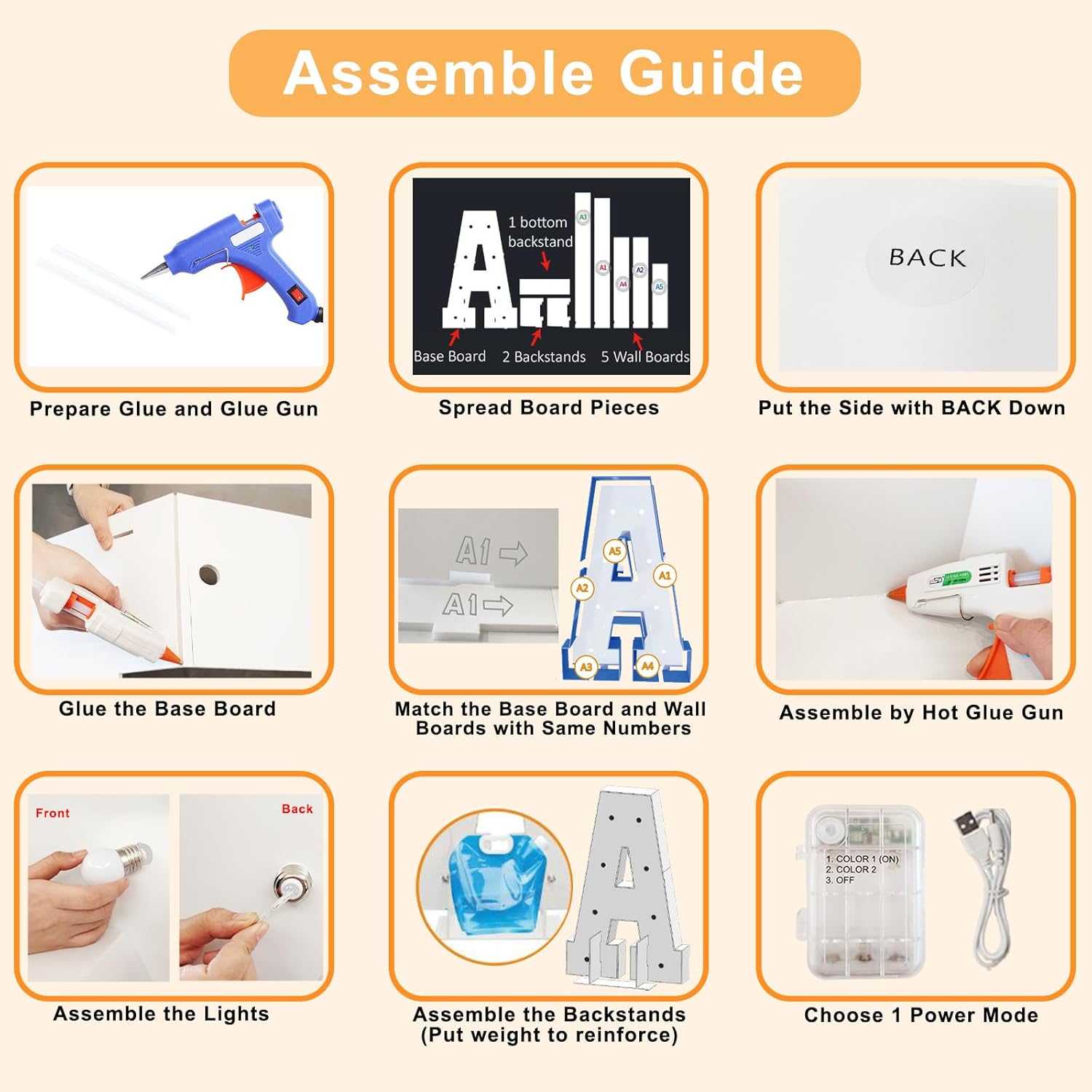 - Easy Assembling Procedure: Pre-cut frame marquee letters are easy to set up: 1) Glue the base board and match the base board and wall boards according to same letter. 2) Glue the base board and wall boards together. 3) Screw the bulbs into the board, connect LED lights and power on. Noted: Glue gun, glue and batteries are not included