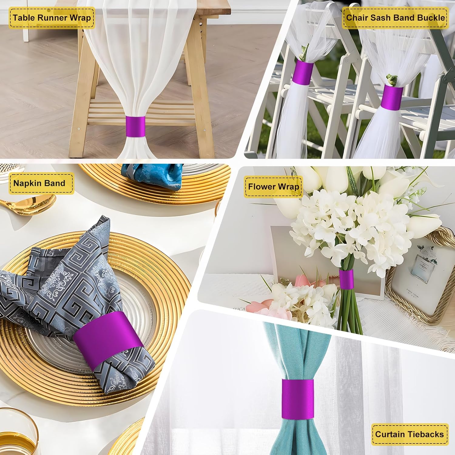 - Usage Scenarios: Use as napkin band, curtain tieback, flower wrap, chair sash band buckle, table runner wrap. Decorate and enhance table settings at home, restaurants, hotels, cruises, birthday party, wedding, Christmas, graduation, church event