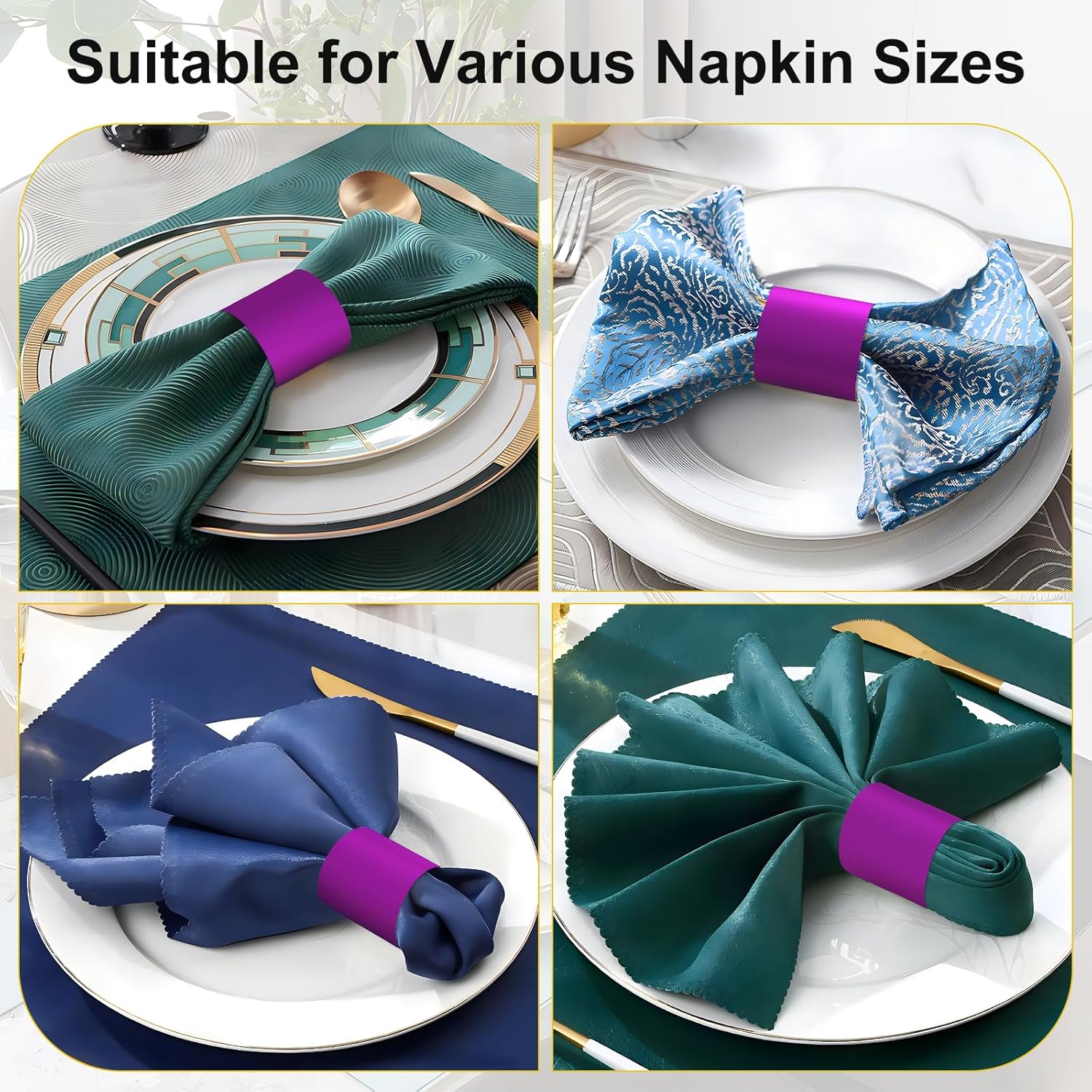 - Fast and Easy to Use: Napkin bands are shipped flat and buckle can be fastened with six sizes to accommodate thin paper to thick cloth napkins. Glue-free, convenient and firm buckle. Transform your ordinary dining experiences to extraordinary one