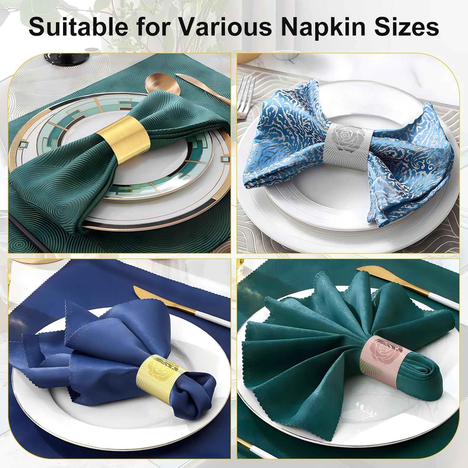- Fast and Easy to Use: Napkin bands are shipped flat and buckle can be fastened with six sizes to accommodate thin paper to thick cloth napkins. Glue-free, convenient and firm buckle. Transform your ordinary dining experiences to extraordinary one