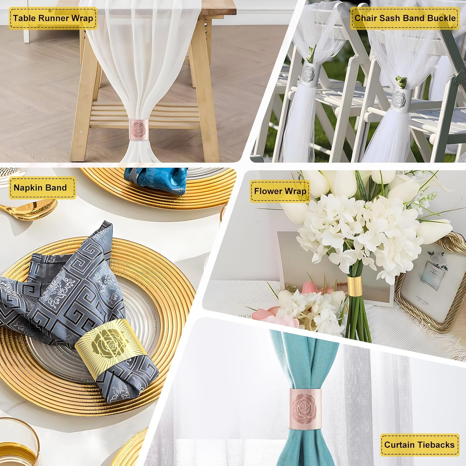 - Usage Scenarios: Use as napkin band, curtain tieback, flower wrap, chair sash band buckle, table runner wrap. Decorate and enhance table settings at home, restaurants, hotels, cruises, birthday party, wedding, Christmas, graduation, church event