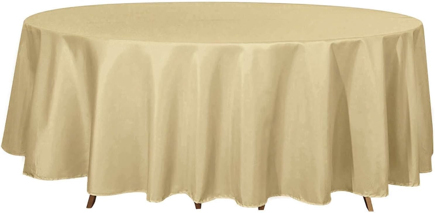 - Quantity: 1 Round Tablecloth Material: 100% Polyester Color: Champagne Size: 108" Round Thickness: 200 GSM Stain & Wrinkle Resistant, Machine Washable 1 piece, seamless design Hemmed edges for an exquisite look. Gives floor length hang on standard 4FT (48") tables All sizes are approximate measurements. Due to different light settings the actual color might vary a bit from the pictures.