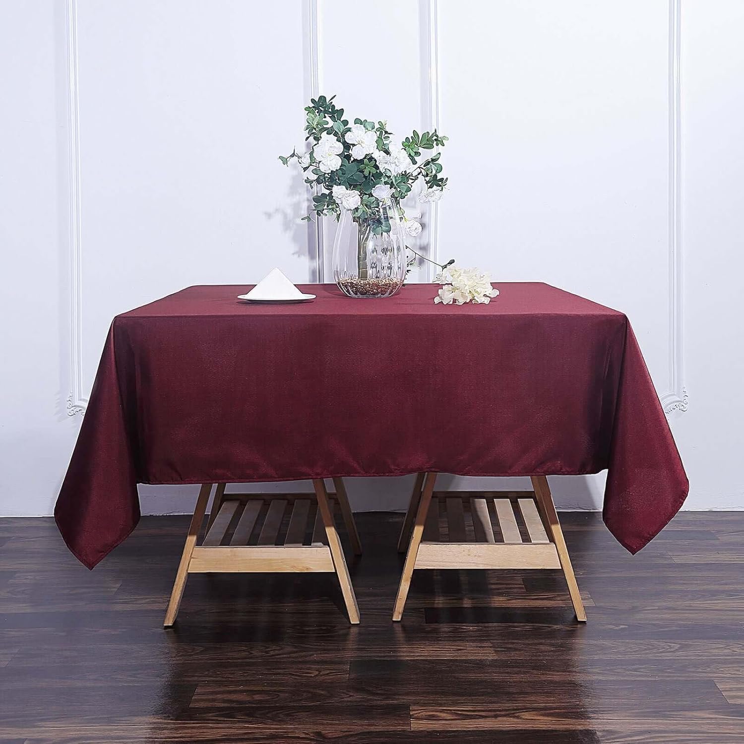 - Quantity: 1 Square Tablecloth Material: 100% Polyester Color: Burgundy Size: 70" x 70" High Quality: 200 GSM Stain & wrinkle resistant, machine washable 1 piece, seamless design Hemmed edges for an exquisite look. All sizes are approximate measurements Due to different light settings the actual color might vary a bit from the pictures.
