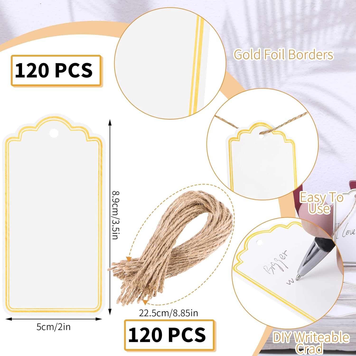 120 PCS Gift Tags with String Gold Foil Metallic Gift Tags Writable Blank Tag for Baby Shower Birthday Wedding Presents Labeling DIY Craft Project Christmas Stocking Stuffers 3.5''×2''