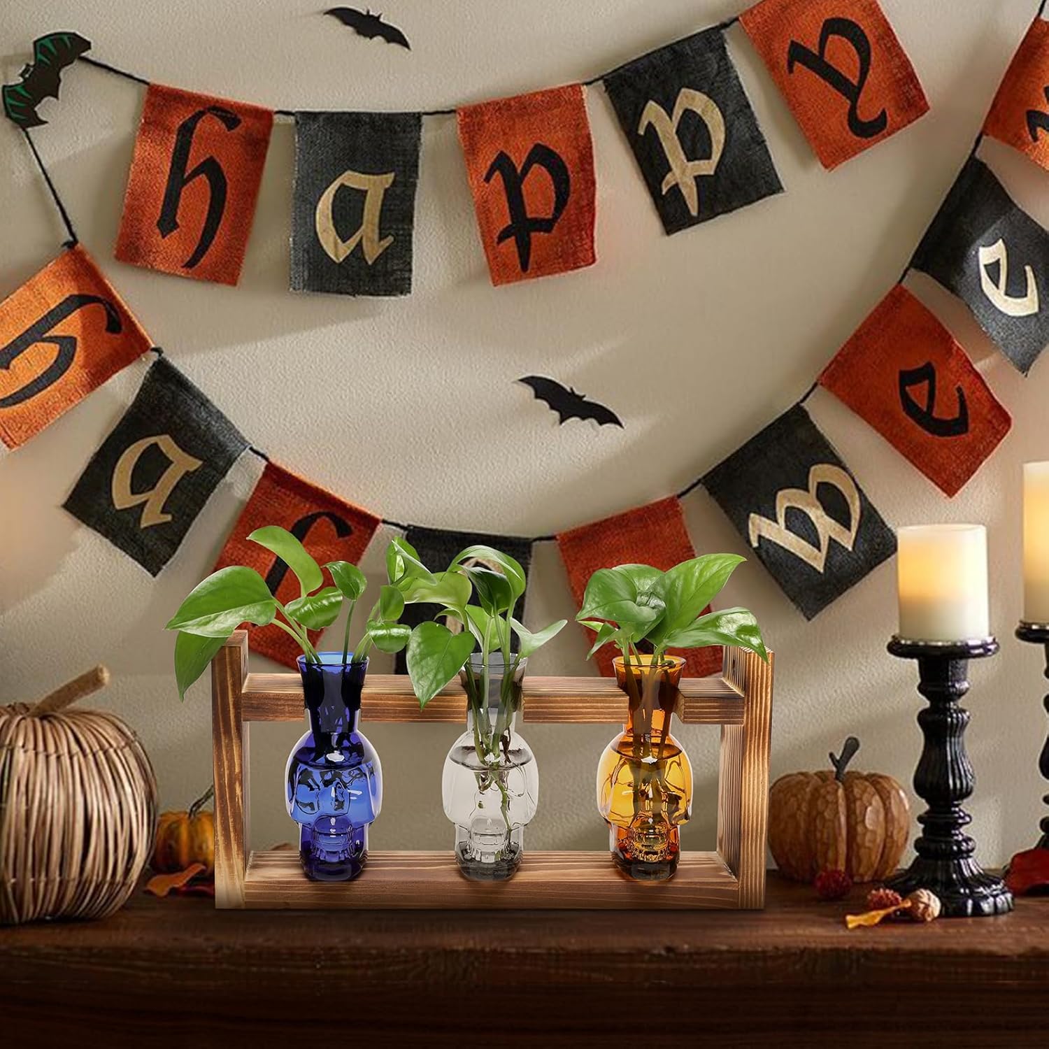 Plant Terrarium Propagation Stations Hydroponics Halloween Skull Planter Vase Skulls Decor with Wooden Stand Gift for Father