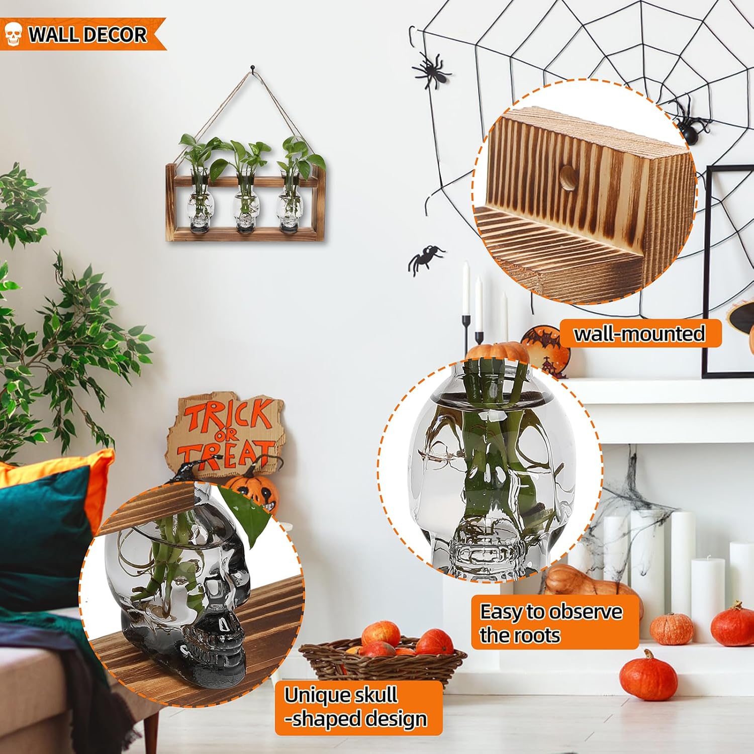 Plant Terrarium Propagation Stations Hydroponics Halloween Skull Planter Vase Skulls Decor with Wooden Stand Gife for Father