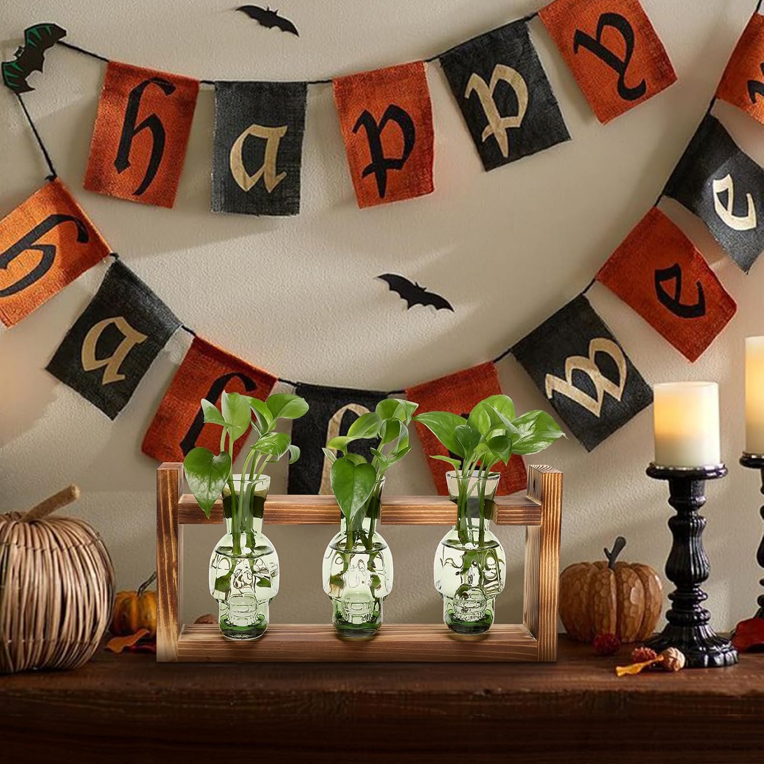 Plant Terrarium Propagation Stations Hydroponics Halloween Skull Planter Vase Skulls Decor with Wooden Stand Gift for Father