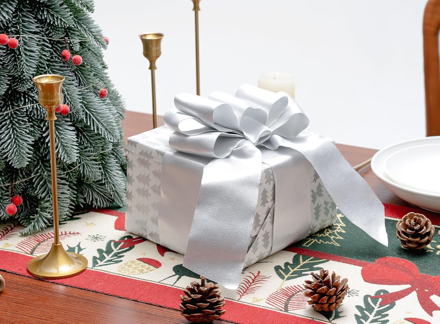 - ELEGANT LUSTROUS SHINE: This satin ribbon has a double-faced backing of smooth and luxurious feel satin ribbon with silver or gold shimmer. The ribbon edges are neatly sewn. It is great for adding an elegant touch to your Christmas tree and gift wrapping