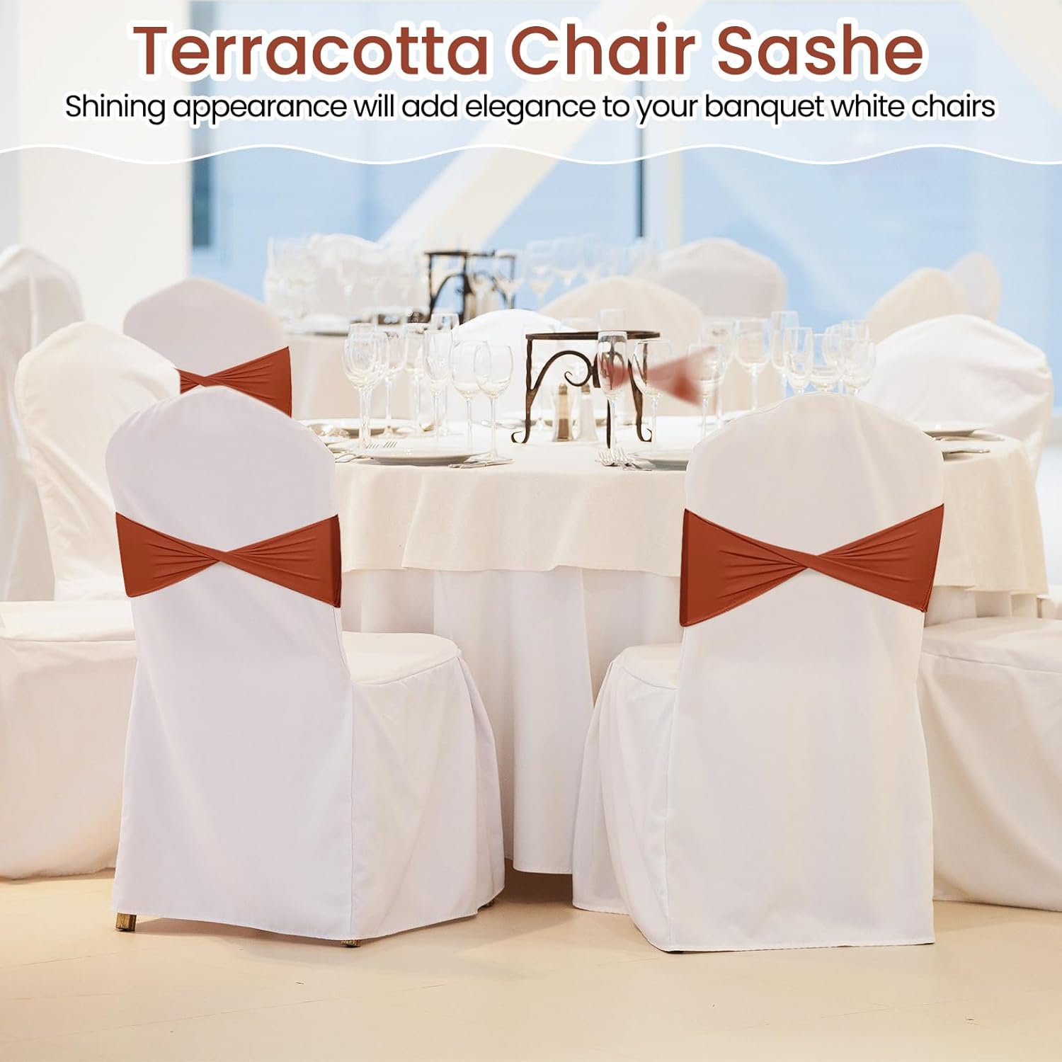 Kinlop 50 Pcs Spandex Chair Sashes Bows Chair Bands Slider Sashes for Covers Elastic Bands Ties Without Buckle Decorations for Wedding Party Events Ceremony Birthday(Terracotta)