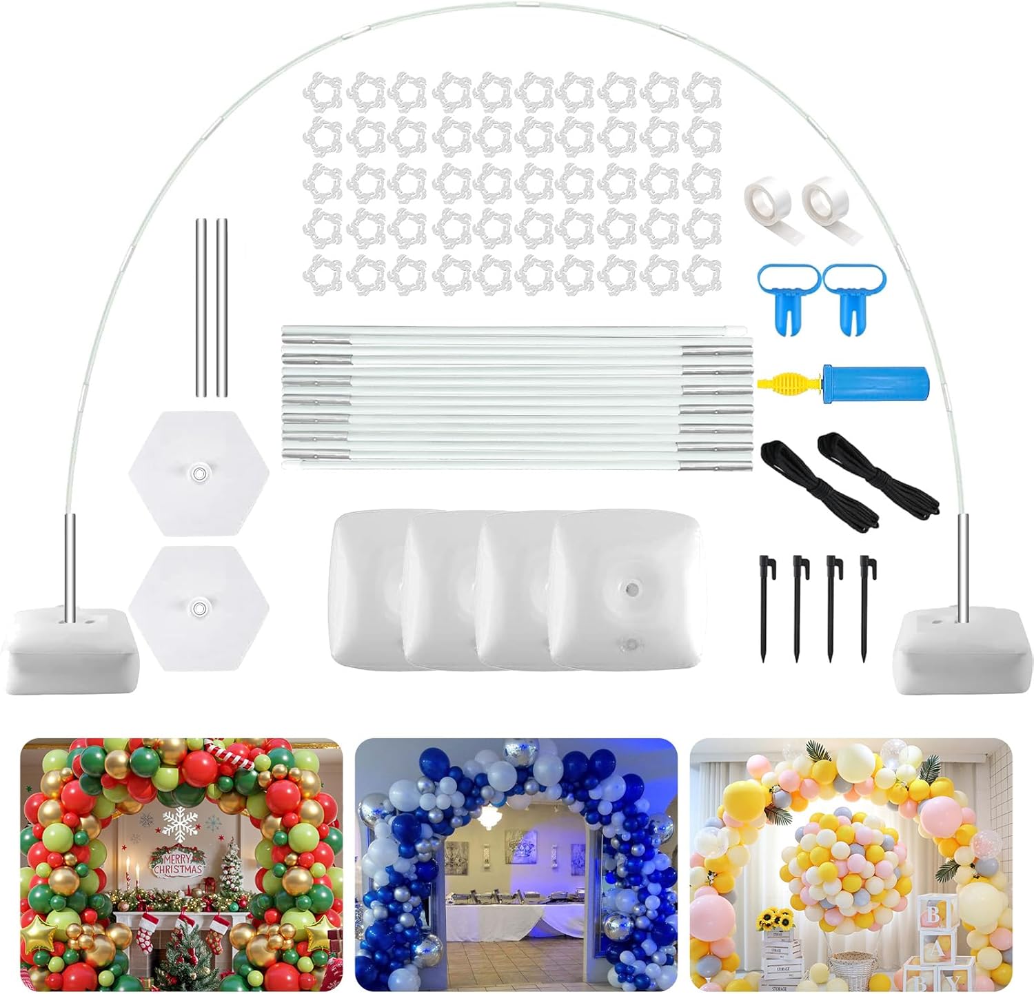 - Balloon Arch Stand Kit Includes: The balloon arch kit package includes 2 x pvc Hexagonal bases, 4 x Water (sand) fillable bag, 15 x folded carbon fiber balloon poles (each 42cm), 2 x 30cm fixed poles, 50 x Balloon clips, 2 x 3-meter fixing ropes, 4 x ground nails, 2 x 1 balloon tape (200 dispensing Points), 2 x balloon knotter, 1 x manual balloon pump. The complete set allows you to make balloon arch decorations in one stop.