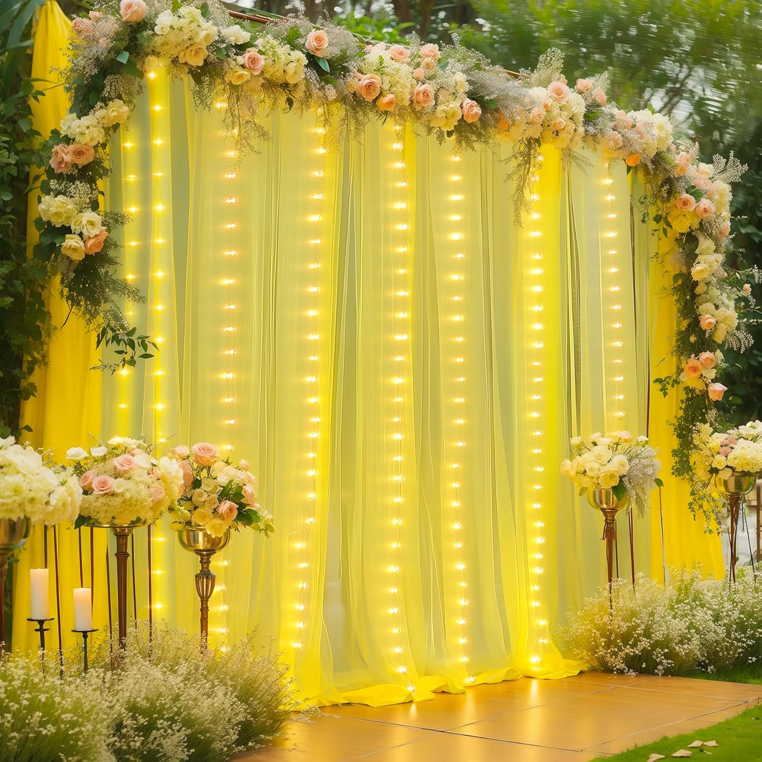 10×10ft Yellow Tulle Backdrop Curtain with Lights String for Parties, Sheer Curtain Backdrop Drapes for Wedding Party Photography Background