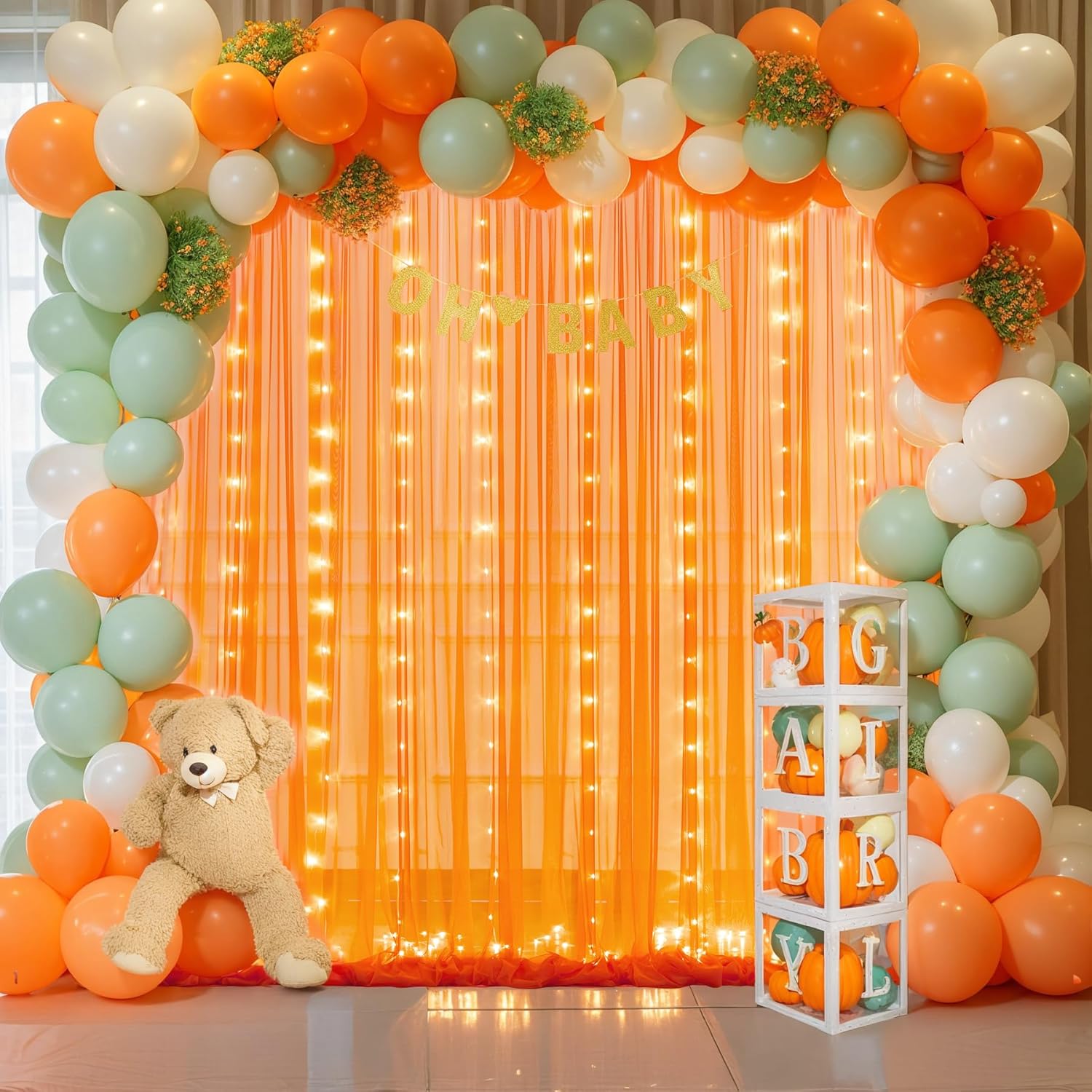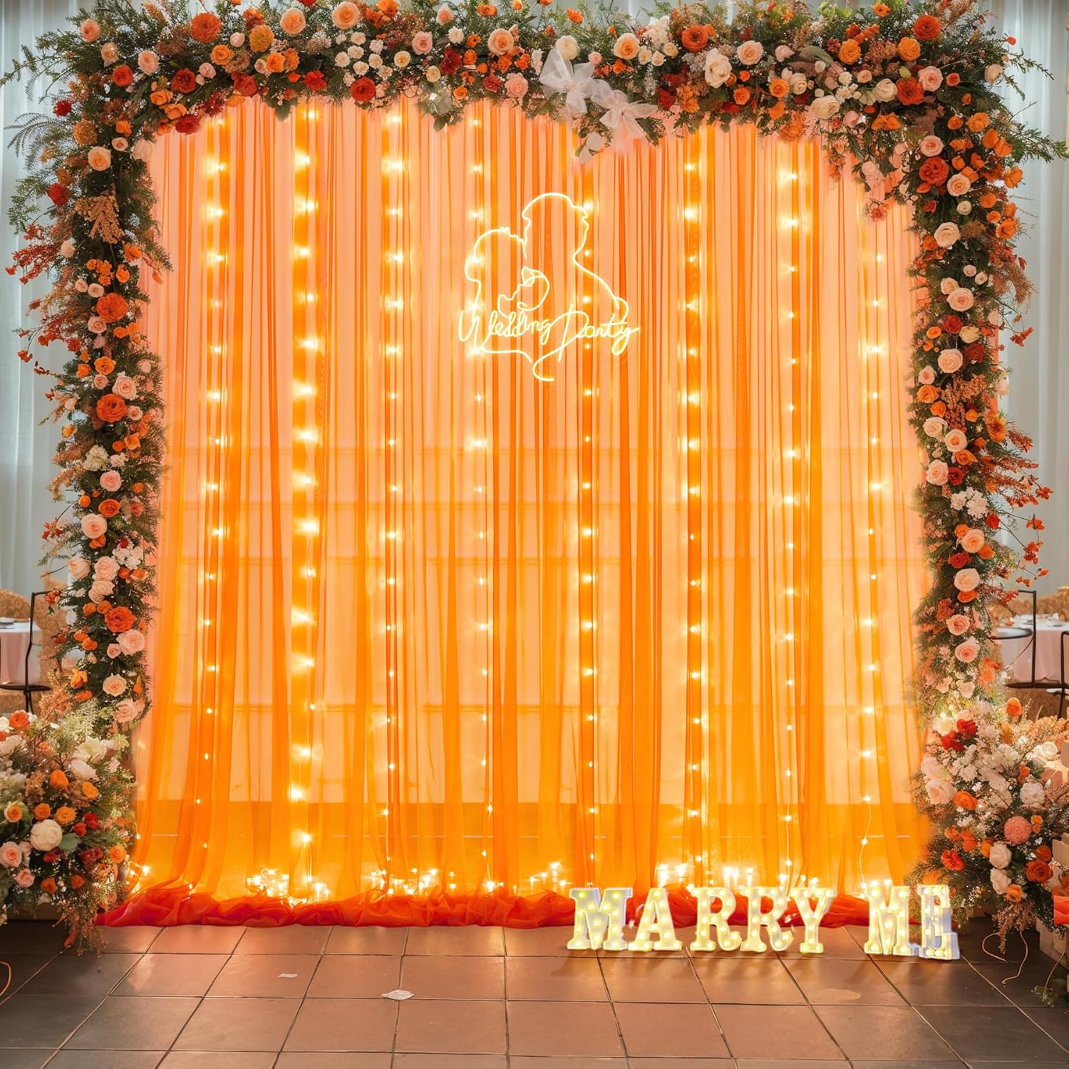 - Orange sheer backdrop curtains with lights wide range of use : Perfect for wedding backdrops for reception, wedding ceremony, photo booth, baby shower, birthday party, gender reveal, bridal shower, engagement, photography backdrop, photoshoot, graduation, home room decorations, candy buffets, dessert tables background, thanksgiving, Halloween Christmas backdrop curtain decorations or anywhere you want.