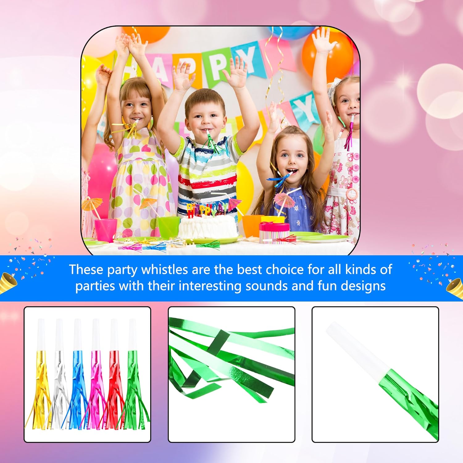 - 【Atmosphere Maker】: Glittering party blowers vibrates quickly, so it can easily make a loud and clear sound, which can bring a fun atmosphere to parties or events and release your excited emotions by blowing them. The tassels are glittering and colorful, eye-catching, flying in the air. It is a fun photo prop. Make your party more lively and bring the party to a climax