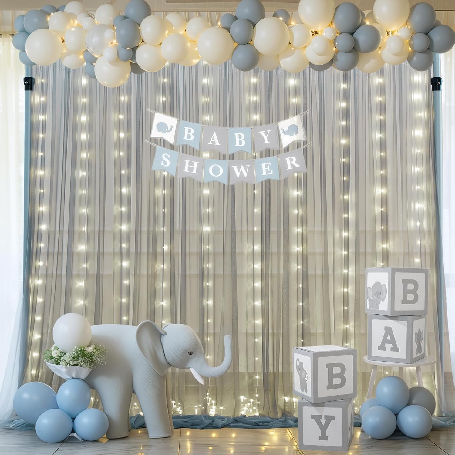 - Silver grey sheer backdrop curtains with lights wide range of use : Perfect for wedding backdrops for reception, wedding ceremony, photo booth, baby shower, birthday party, gender reveal, bridal shower, engagement, photography backdrop, photoshoot, graduation, home room decorations, candy buffets, dessert tables background, Christmas backdrop curtain decorations or anywhere you want.