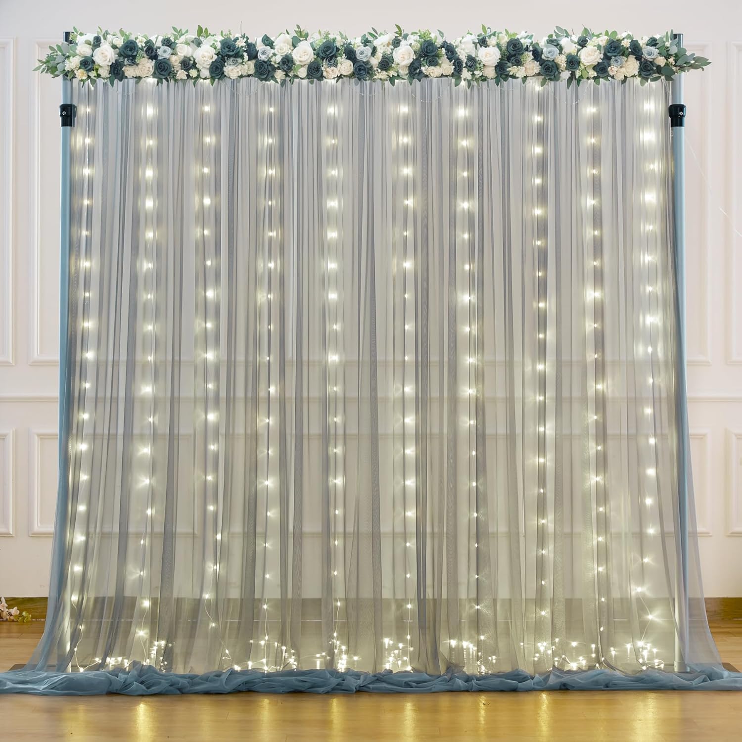 - Products include: 10ft Γ 10ft wrinkle free silver grey sheer tulle backdrop curtain, a set of 9.8ft warm white string light and 12pcs Transparent clips (no remote control).