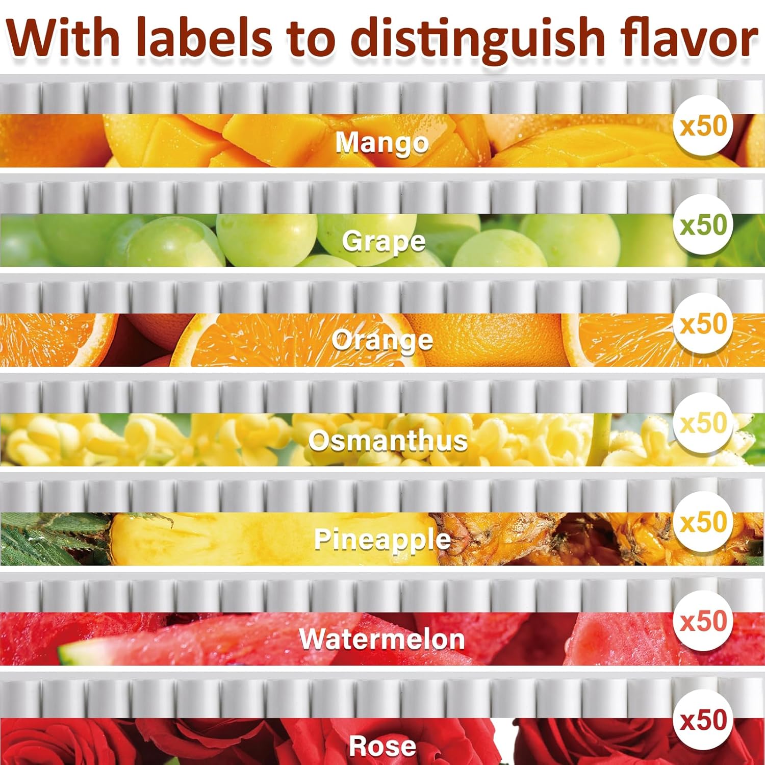 - 【7 Flavors Lip Balm】Watermelon, Pineapple, Mango, Rose, Grape, Orange, and Osmanthus. You will get 350 tubes with 50 of each flavor. Ensuring you have an ample supply for all of your needs-Labels are built into the box to help distinguish flavors