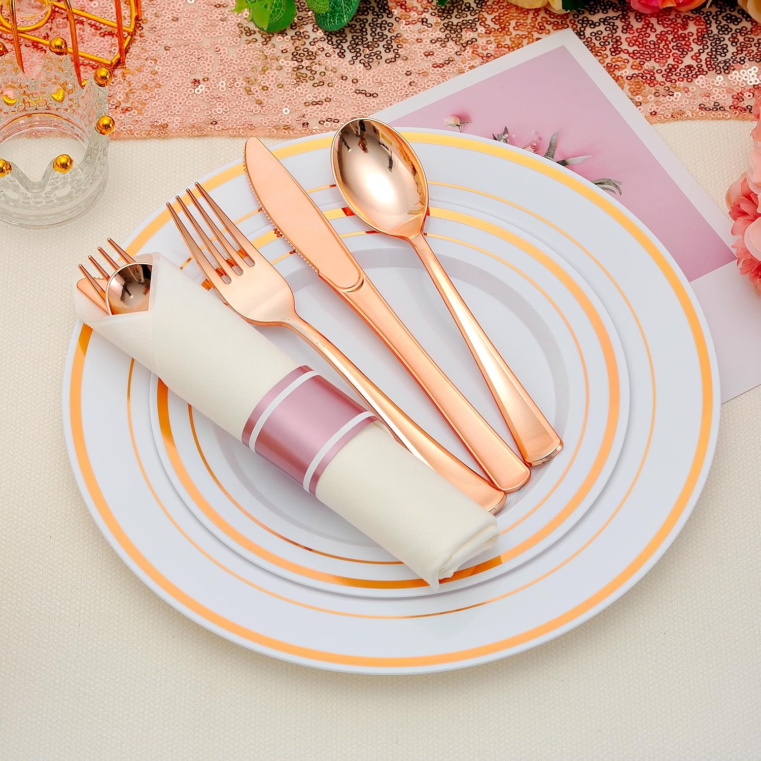 - COMPLETE TABLEWARE SET: One for all needs!This disposable rose gold cutlery set includes a total of 400 pieces of flatware. You will receive includes rose gold 100 forks, 100 spoons, 100 knives and 100 napkins. Measurements: Napkin: 12β x 17β, Fork: 7.40"L, Knife: 7.84"L, Spoon: 6.89"L. Available for up to 100 guests for your dining needs.
