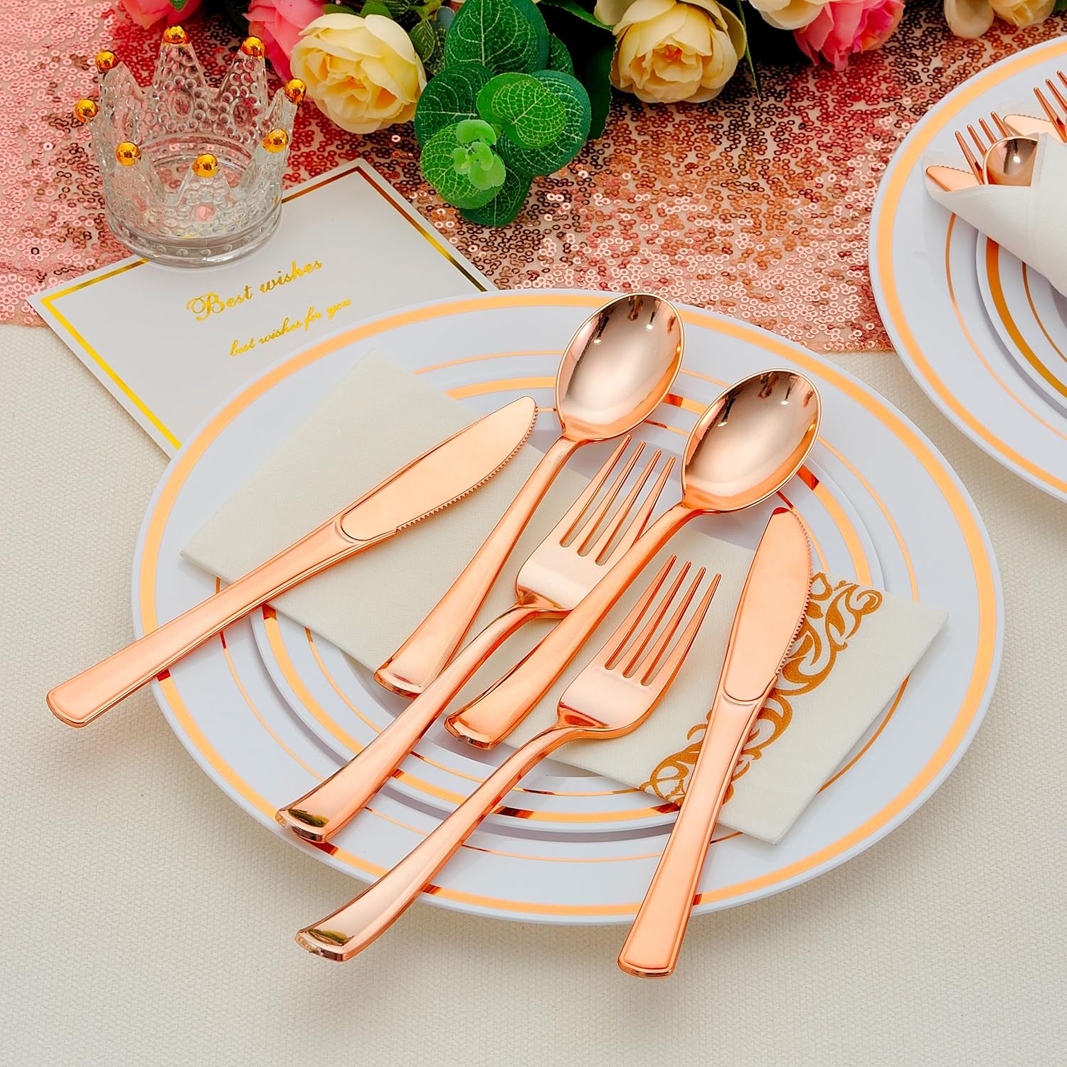 - SUITABLE FOR ANY PARTY OCCASION: These elegant rose gold plastic silverware boast a smooth surface and metallic luster that closely resembles real silverware. They are perfect for a wide range of events, including festivals, Wedding, family gatherings, outdoor parties, baby showers, birthdays, and other special occasions. The addition of this exquisite tableware will bring an air of elegance, sophistication, and upscale ambiance to your event or party.