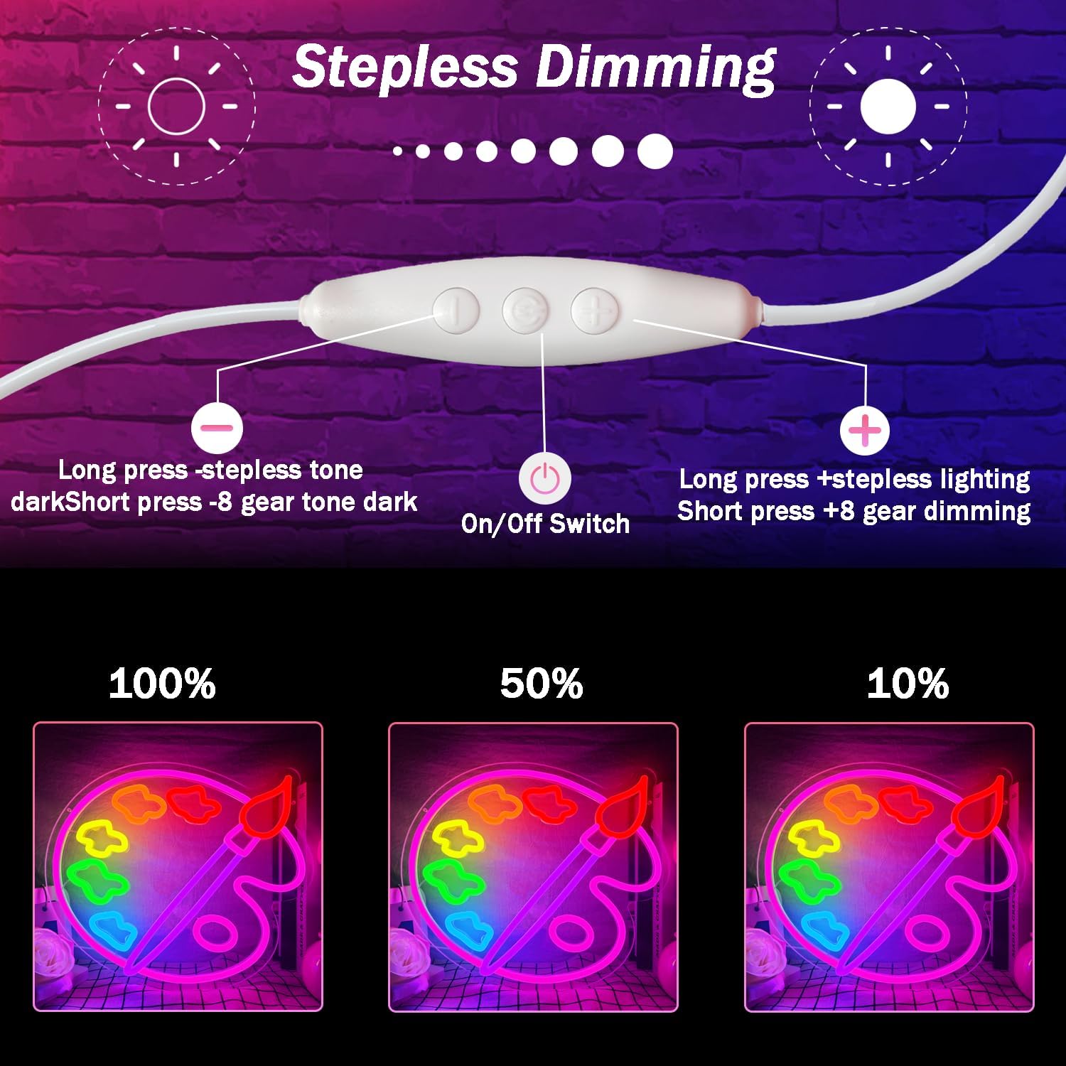 - 【Adjustable Brightness】This Paint Palette LED neon lights is equipped with a built-in dimmer, which can easily adjust the brightness. Whether you like soft light to create a warm atmosphere, or need bold light to highlight your personality, it can meet your needs. You can fully control the intensity of the lighting to create the ideal light and shadow effect for any occasion.