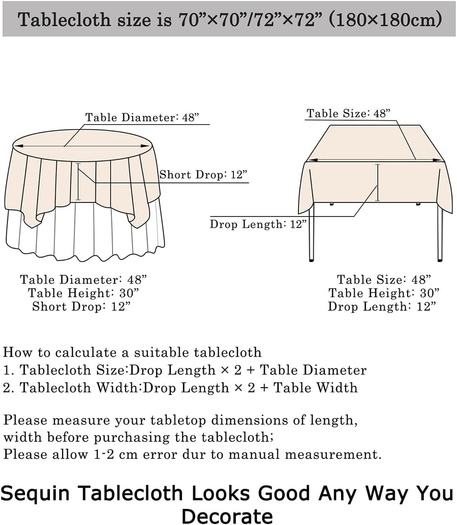 - SIZE OF SEQUIN TABLECLOTH : 2 pack 72x72 Inch gold Sequin Tablecloths Table Linen, this small square tablecloth is fit for a 4FT round or square table.