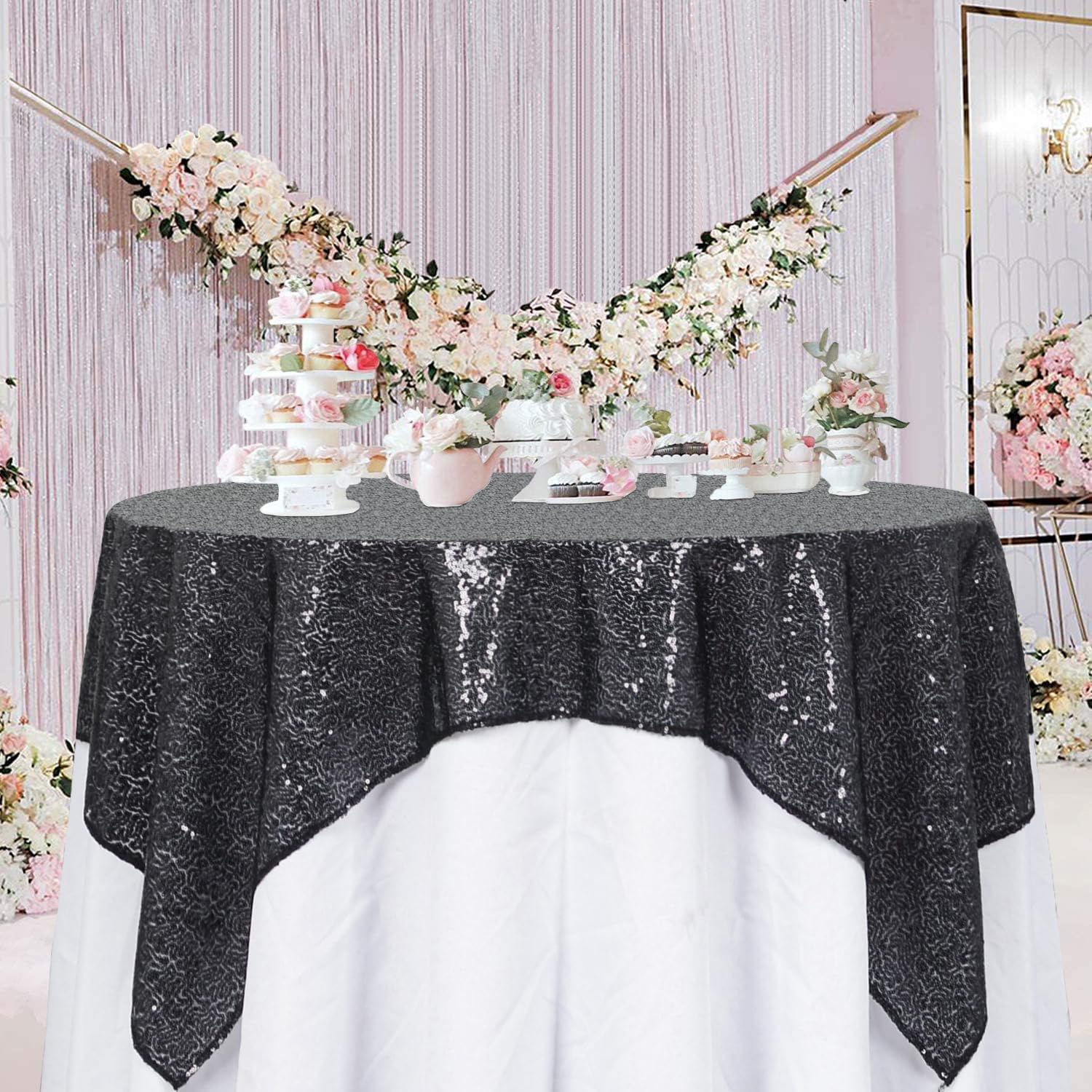 - NO DROPPING SEQUINS : This sparkle table cover overlay with serged edges avoid falling sequins, beautiful colors of sequin tablecloth ensure your wedding party birthday christmas prom decoration dessert cake tables more elegant and sparkly