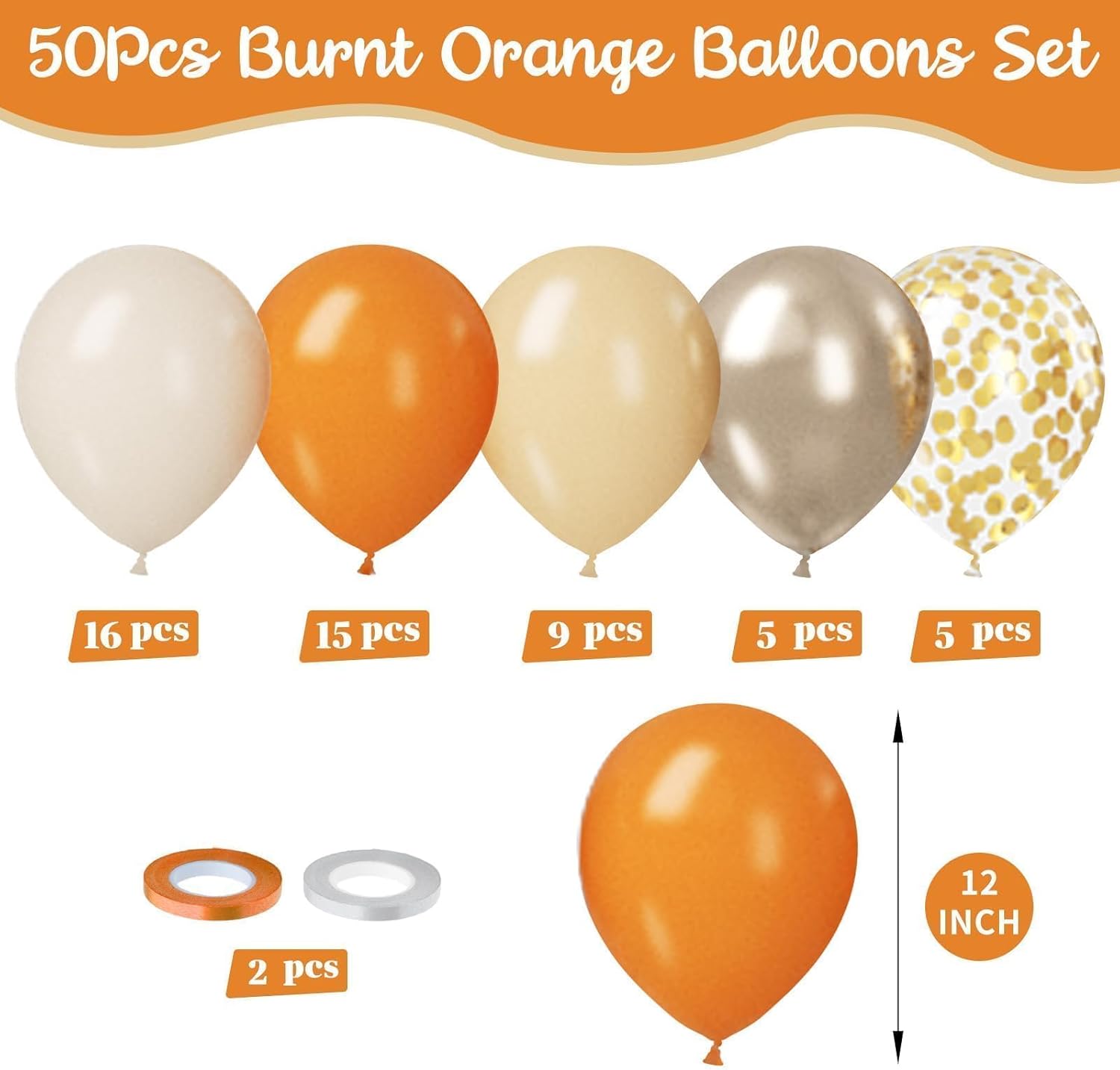 - 【WHAT YOU WILL GET】Our birthday party balloons include 50pcs retro orange and sand white balloons, designed to help you create stunning decoration: 16 x retro sand white balloons, 5 x metallic champagne gold, 9 x retro apricot balloons, 15 x retro orange balloons, 5 x confetti gold balloons, 1 x orange ribbon, and 1 x white ribbon. The size of the balloon is about 12 inches after inflation. The combination of orange and champagne gold can make party or occasion more classy.