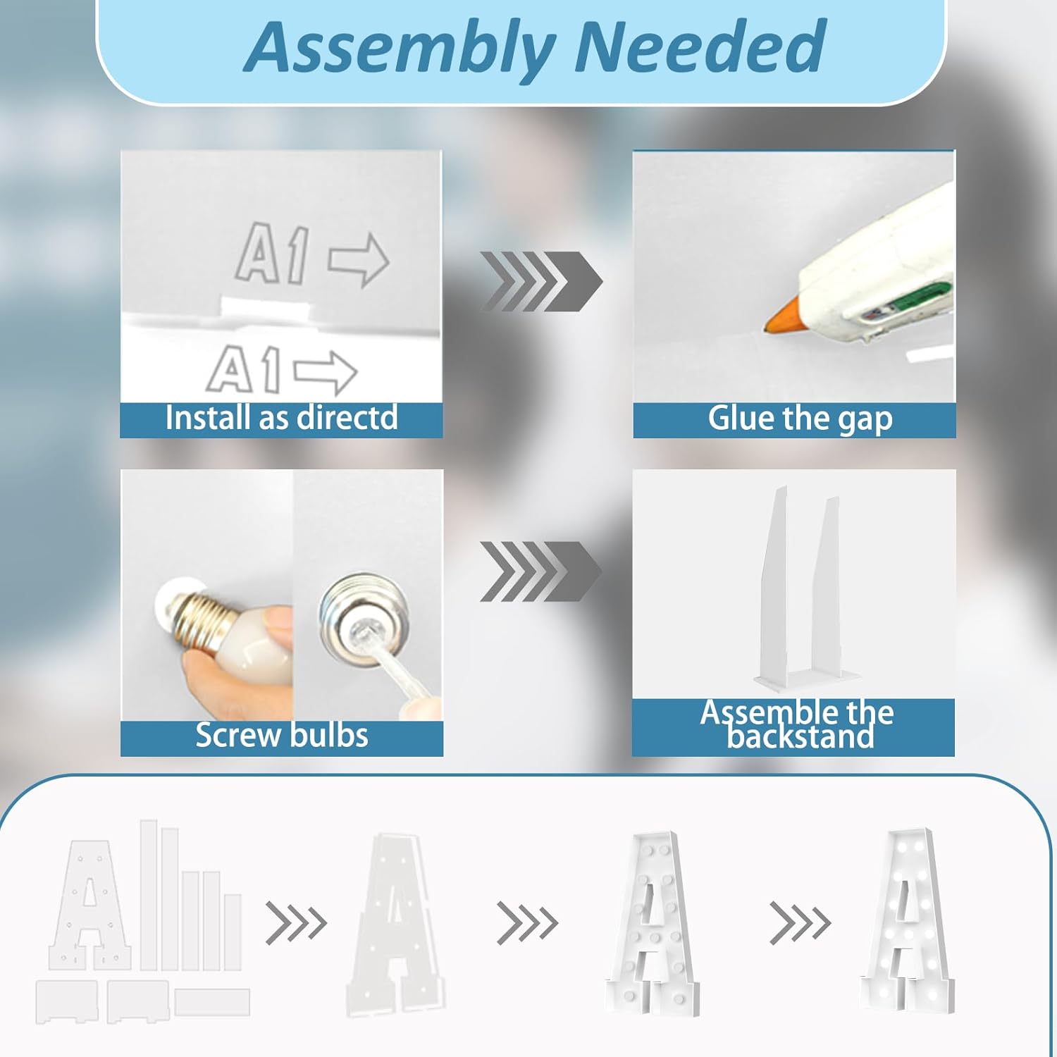 - 【Assembly Required】Each marquee light up letter is made of precisely pre-cut foam board, comes with the same model of light string and LED bulb, and a user-friendly instruction manual. According to our installation manual, ① Fold the side panels along the cutting line and stick them to the bottom panel with hot melt glue according to the corresponding number. ② Screw the bulb onto the single board, and then install the LED light string into the bulb. (Note: Glue gun and battery not included)