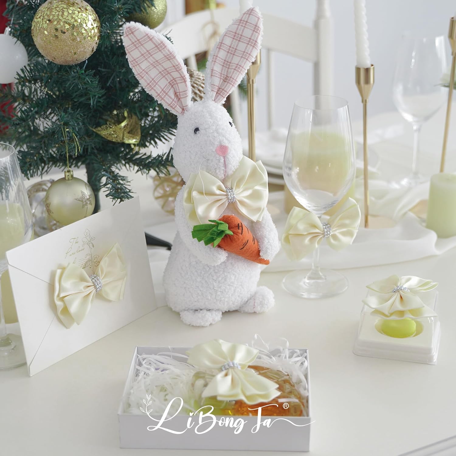Ivory Satin Bows 4'' Premade Ivory Ribbon Bows, Gift Bows with Rhinestone, Wrapping Bows for Presents, Greeting Cards, Treat Bags, Wine Bottles, Valentines Bows for Gift Wrapping-12 Counts
