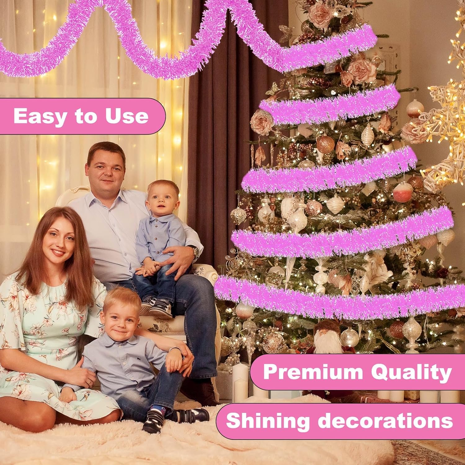 - Easy to Use: You can just hang the tinsel garland ornament on the christmas trees, not need many tools, and if you want to decorate them on the walls or stairs, you can use glue to stick them up, also use scissors to cut to the right length, twist them into various shapes as you like, then hang on to make your home full of joyful feelings